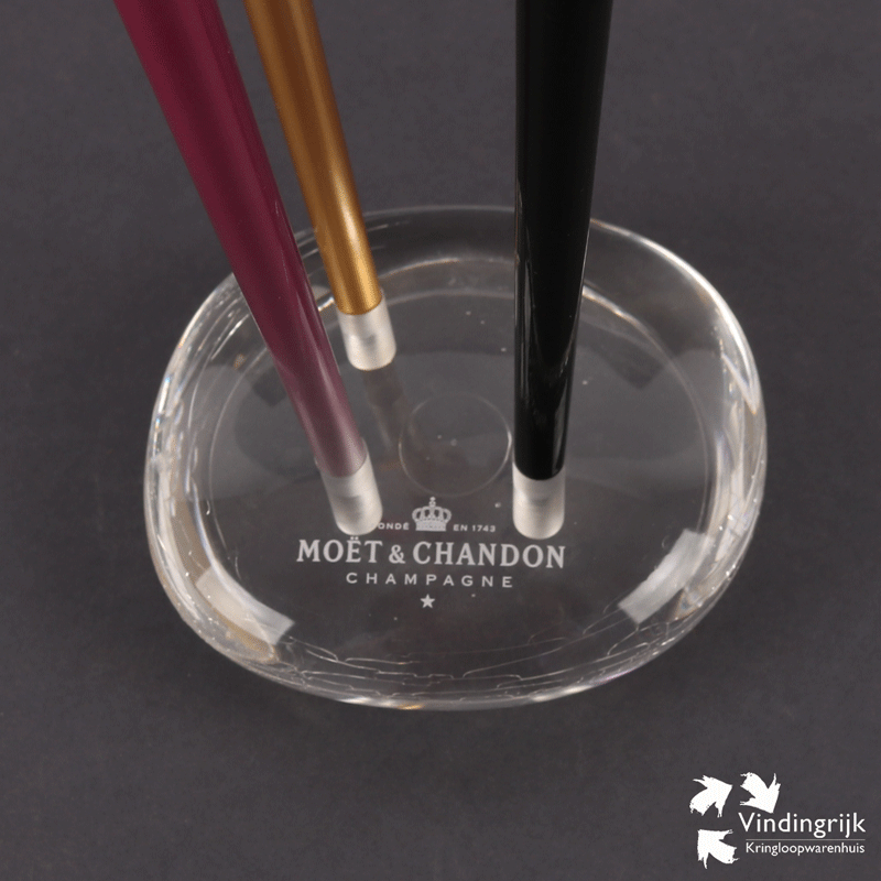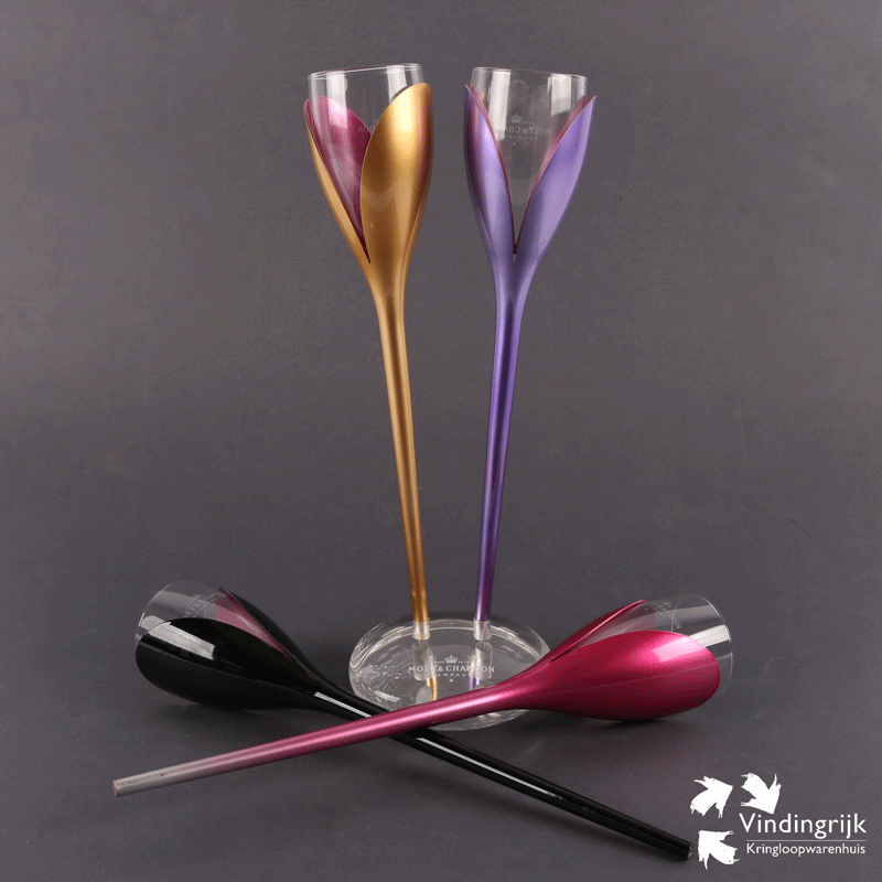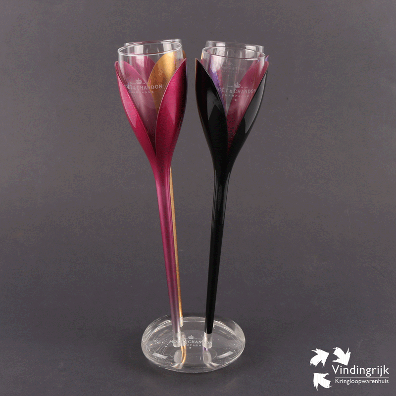 Mooie set van 4 tulpglazen op een plexiglas voet van het champagnemerk Moët & Chandon. De glazen zijn uit de houder te halen, zodat ze gereinigd kunnen worden. De tulphouders van kunststof zijn er in verschillende metallic kleuren: rosé, zwart, paars en rood.