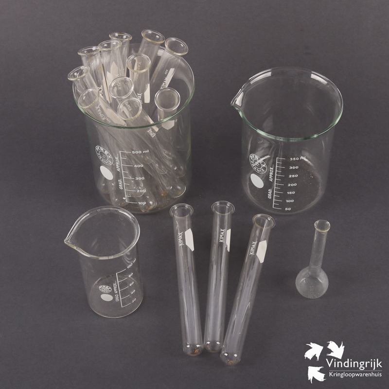 De set bestaat uit 3 maatbekers (500ml, 350ml en 100ml) van hittebestendig Pyrex uit Frankrijk, een mini platbodemkolfje en 14 reageerbuisjes.