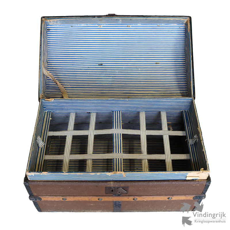 De koffer heeft van binnen decoratief papier, blauw-wit gestreept en is voorzien van het originele uitneembare binnenvak met linten. Deze grote koffer biedt voldoende ruimte om allerhande spullen in op te bergen.