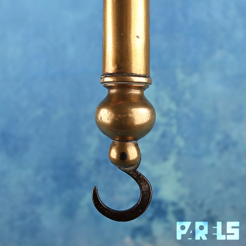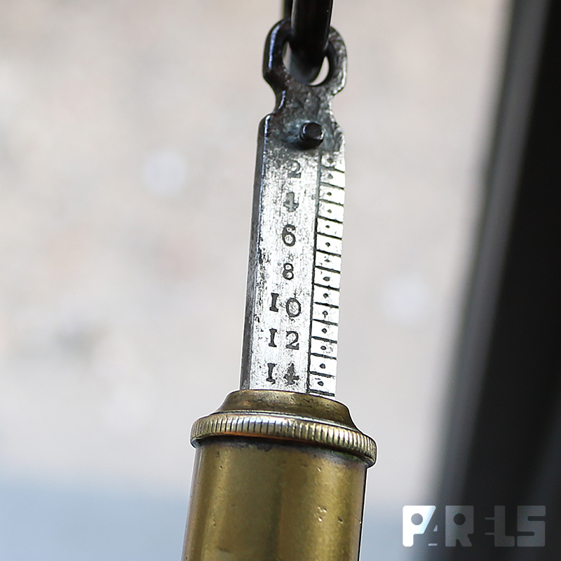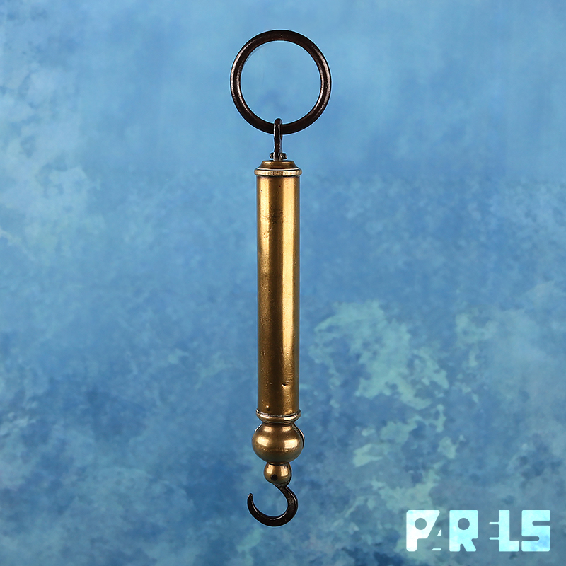 Antieke messing veerunster, ook wel een unster of veerweegschaal genoemd. Dit instrument werd vroeger gebruikt om gewichten te meten in onder andere handel, landbouw en huishoudens. Het is een type weegschaal dat de zwaartekracht meet door middel van de uitzetting van een veer. De ring aan de bovenzijde maakt het mogelijk om de unster op te hangen, terwijl de metalen haak onderaan geschikt is om allerlei objecten aan te bevestigen. Het gewicht lees je vervolgens bovenaan af (zie foto 3).