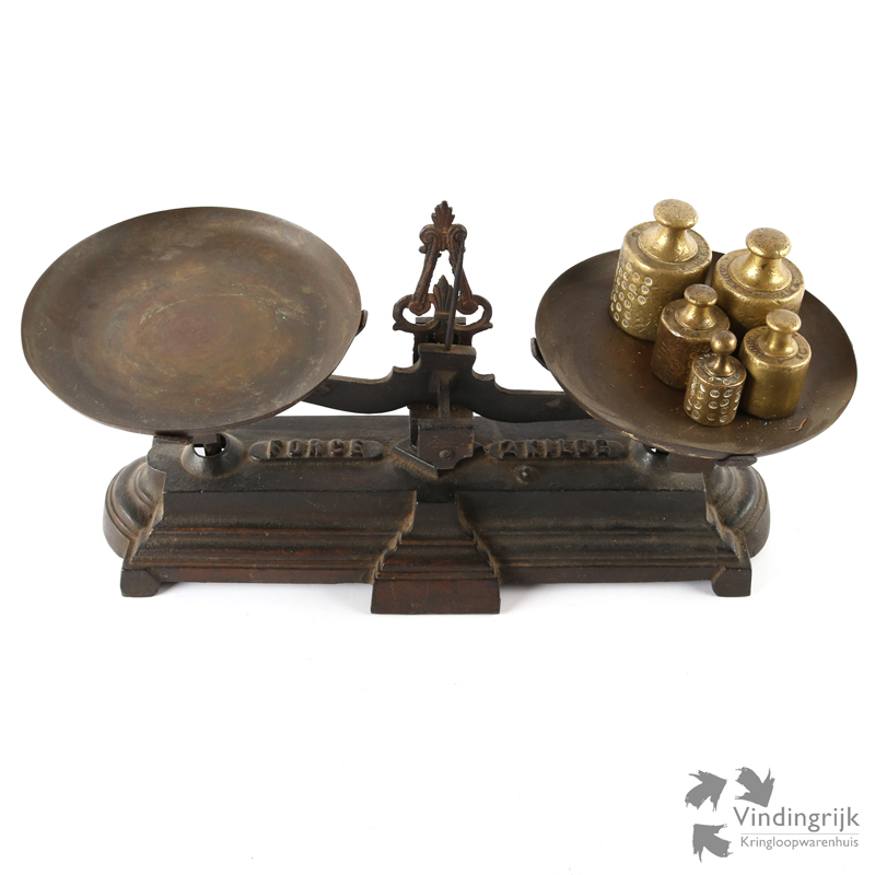 Authentieke weegschaal, gemaakt van gietijzer. De schaaltjes zijn van koper. De weegschaal weegt tot 2 kilo en wordt geleverd met