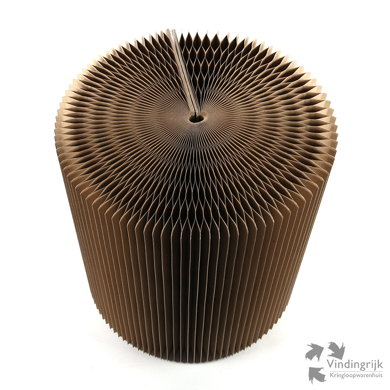 Erg leuk en bijzonder bijzettafeltje, gemaakt van gerecycled karton en in harmonica gevouwen zodat het een plat pakketje wordt. Het kan eenvoudig in elkaar gezet worden d.m.v. de twee klittenbandjes. Ook te gebruiken als krukje. Hij is makkelijk weer op te vouwen en opnieuw in elkaar te zetten, dus ideaal wanneer je bijvoorbeeld onverwachts een zitplek te kort komt.