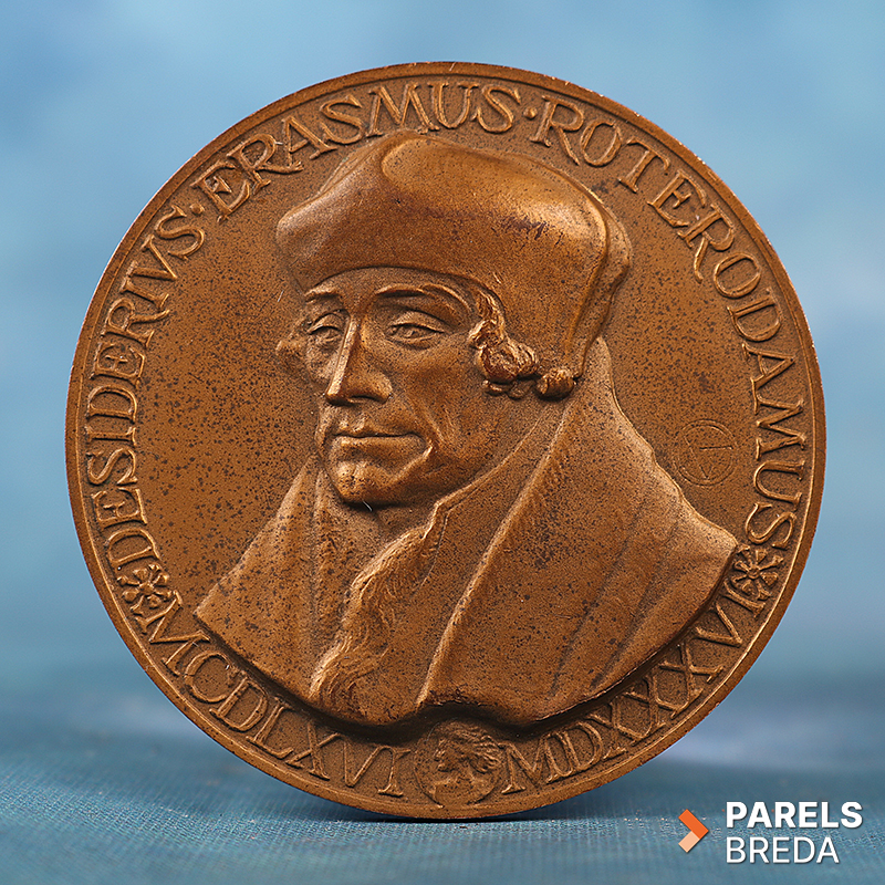 Deze bronzen penning toont een klassiek reliëfportret van Desiderius Erasmus, omgeven door een Latijnse randinscriptie met zijn naam en sterfjaar. Het ontwerp is gebaseerd op het beroemde humanistische penningtype dat in de 16e eeuw werd ontwikkeld en later meermaals is hernomen als intellectueel eerbetoon.
