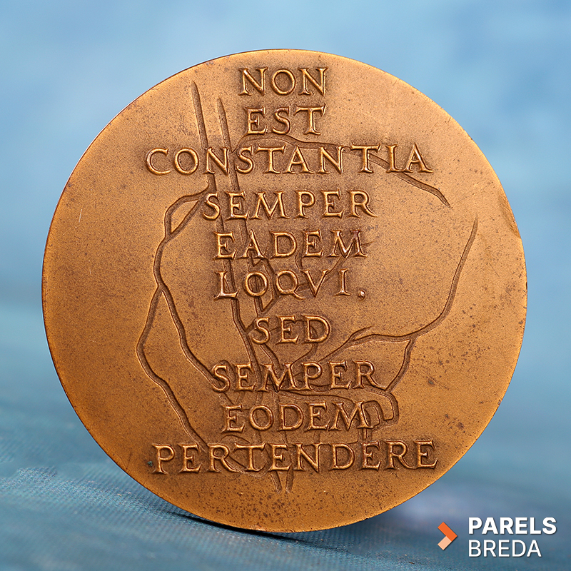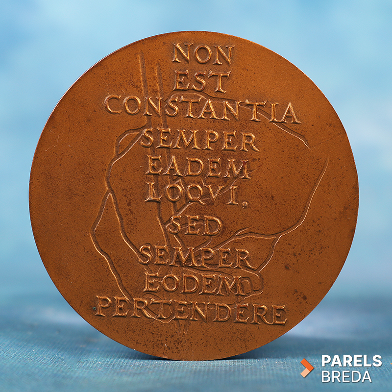 De keerzijde draagt de Latijnse spreuk “Non est constantia semper eadem loqui, sed semper eodem pertendere.” Deze tekst kan worden vertaald als: niet steeds hetzelfde zeggen, maar wel altijd naar hetzelfde doel blijven streven. De spreuk verwoordt kernachtig het humanistische gedachtegoed van Erasmus, waarin standvastigheid wordt gezien als trouw blijven aan principes, niet aan vaste formuleringen. Het bijbehorende scheurmotief versterkt deze inhoudelijke betekenis en geeft de keerzijde een symbolisch karakter.