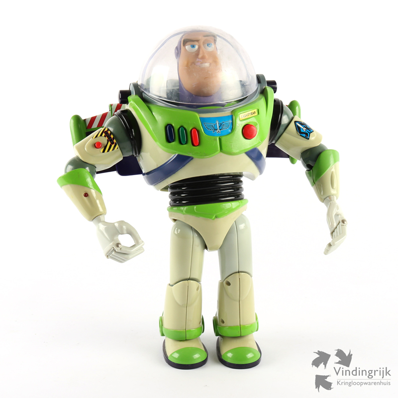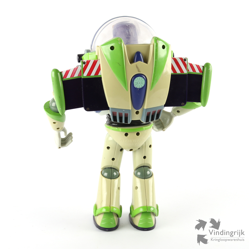 Deze stoere Buzz Lightyear heeft een helm die echt open en dicht kan, hij heeft beweegbare armen en benen en zijn vleugels kunnen open klappen.