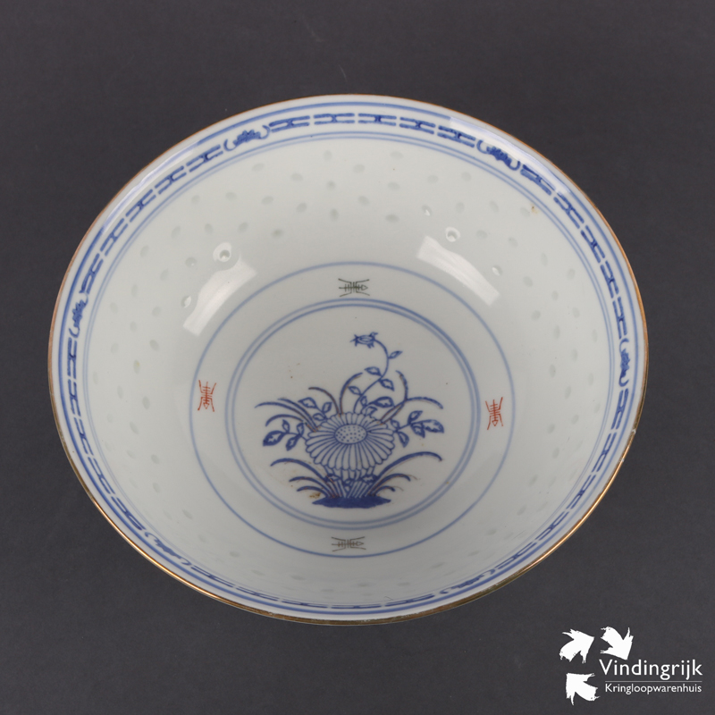 De traditionele Chinese rijstkom of soepkom in basiskleur wit met blauwe beschildering en een goudkleurig randje. Aan de zijkant zijn ondergaande zonnen geschilderd in de kleur zalm. In het glazuur zitten meegebakken rijstkorrels.