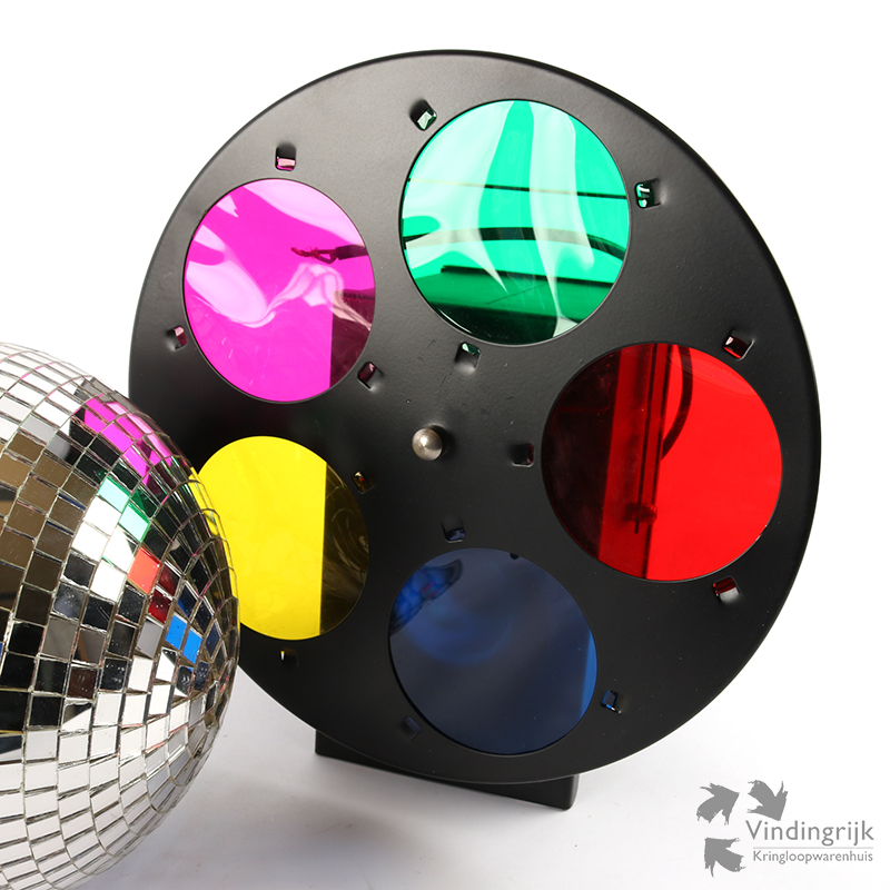 Belicht de spiegelbol met de lamp en door de draaiende kleurenschijf heeft de ruimte iedere keer een andere kleur.