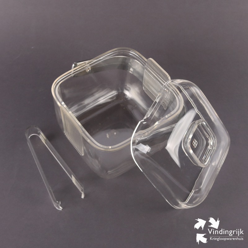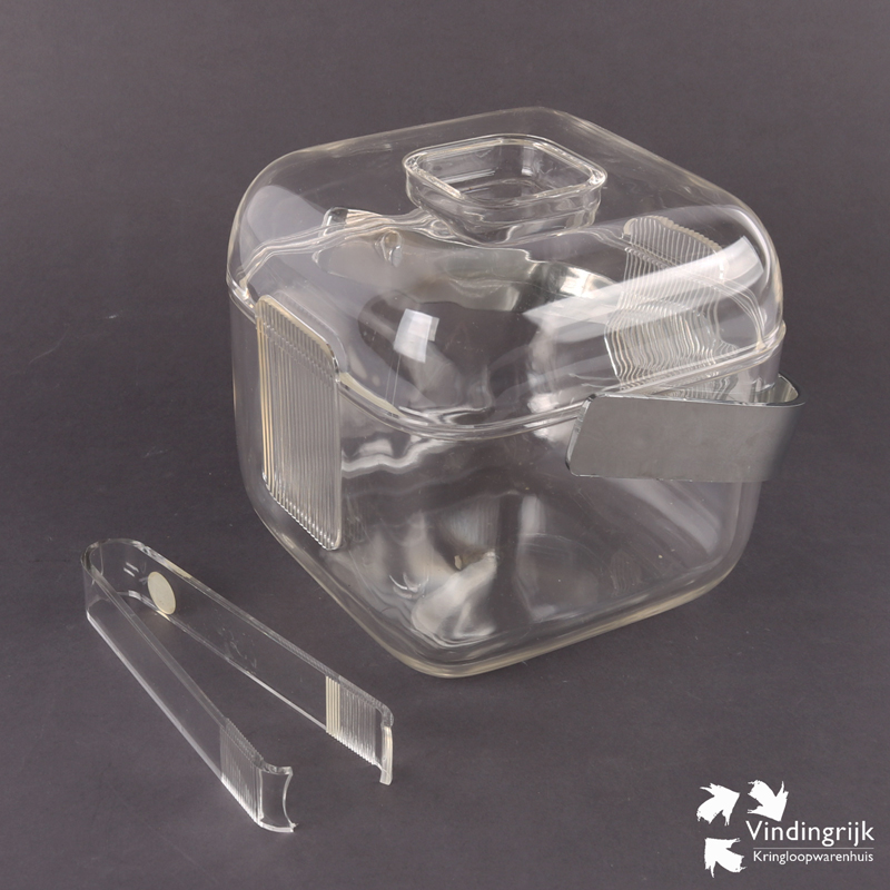 Ijsemmer van het merk Guzzini. Deze transparante kunststof ijsemmer in kubusvorm is een ontwerp uit de jaren ’80 van Ambrogio Pozzi. De ijsemmer heeft een transparante, uitneembare binnenbak en een verchroomd kunststof handvat.