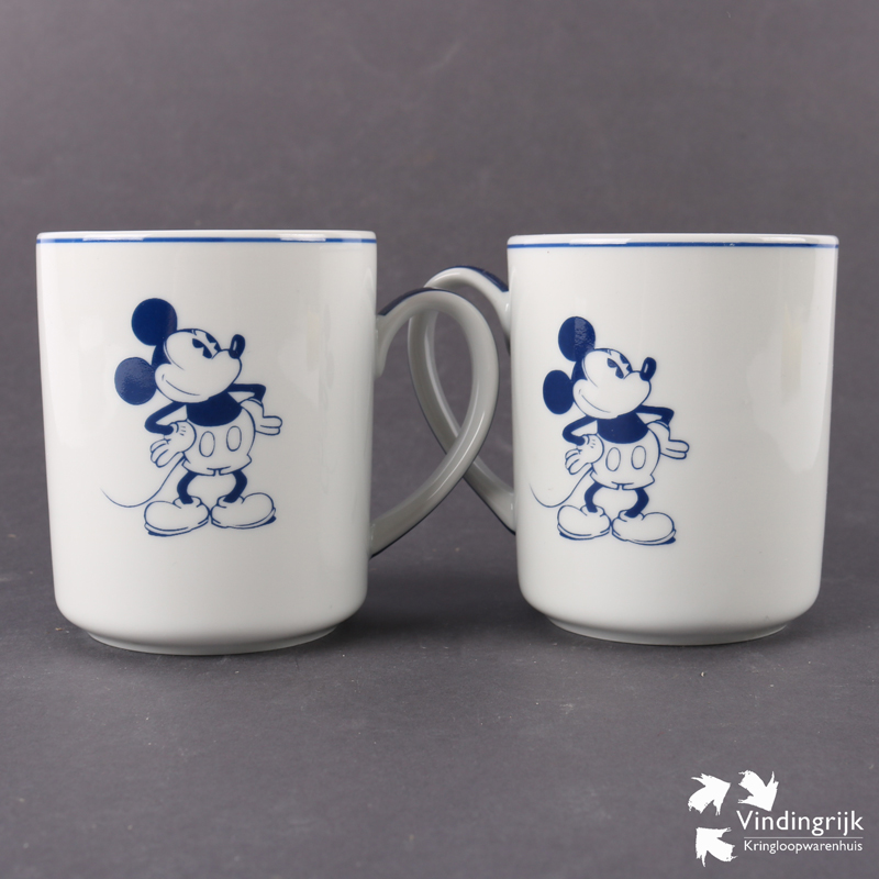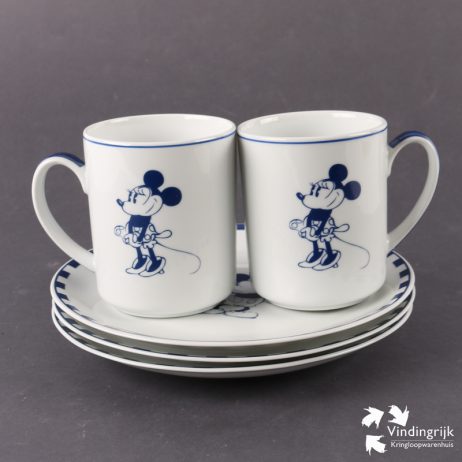 Leuke maar incomplete ontbijt set van Guy Degrenne gemaakt van porselein. De set bestaat uit 3 ontbijtbordjes en 2 mokken, met de afbeeldingen van Micky en Minnie Mouse erop in blauw. Langs de randen van de ontbijtbordjes is er ook een blauwe rand.