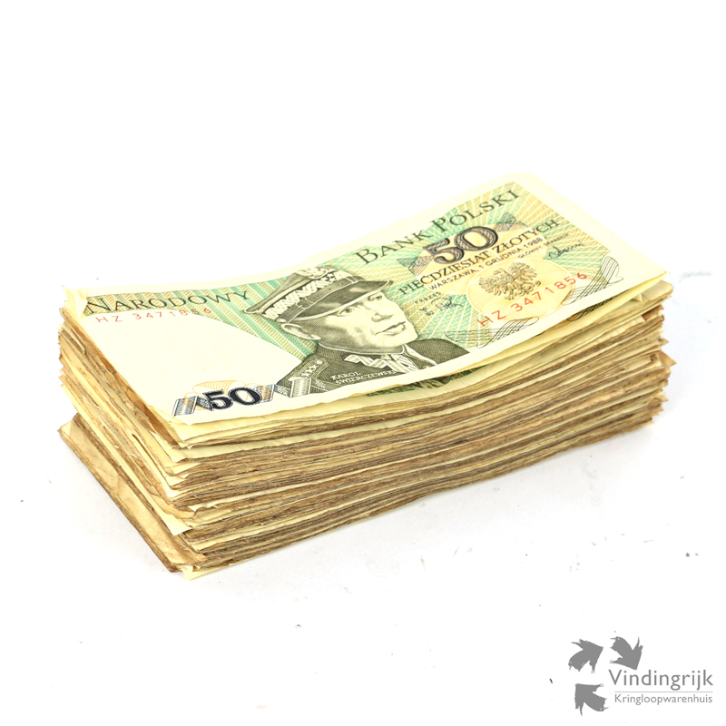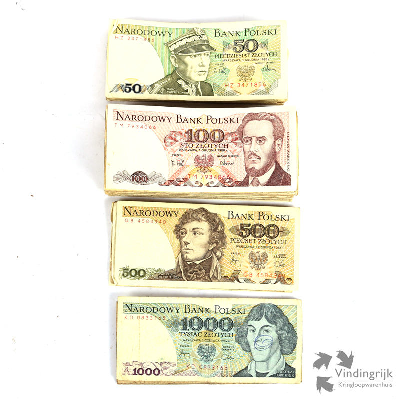 Stapel Poolse bankbiljetten van 50, 100, 500 en 1000 Zloty. De biljetten dateren van de jaren ’80 toen het communistische regime nog heerste in Polen.