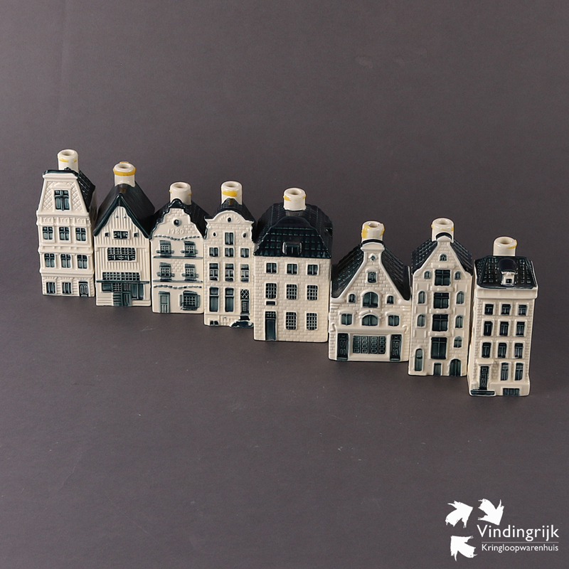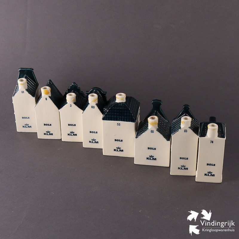 Set van 8 KLM huisjes Delfts Blauw. Sinds de jaren 50 geeft KLM elke passagier in business class een Delfts blauw miniatuur van een karakteristiek Hollands huisje gevuld met jenever van Bols.