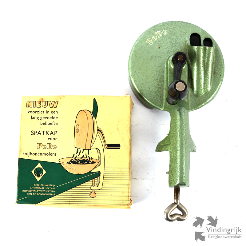 Snijbonenmolen van het merk Pede. De molen is gemaakt van staal en is groen afgewerkt.
