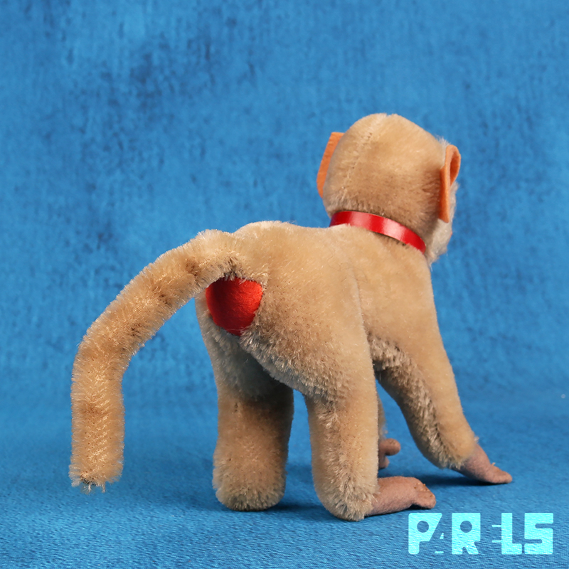 De aap is voor zijn leeftijd in erg goede staat. De Steiff-knop en label in zijn oor ontbreken helaas, zijn originele naamlabel zit wel aan de rode halsband bevestigd.