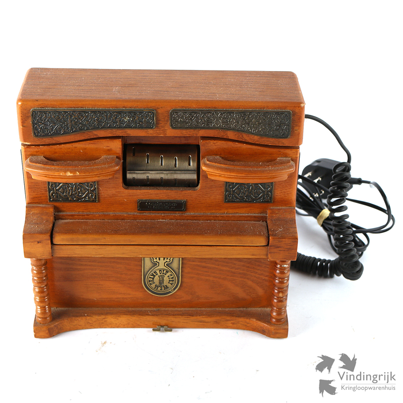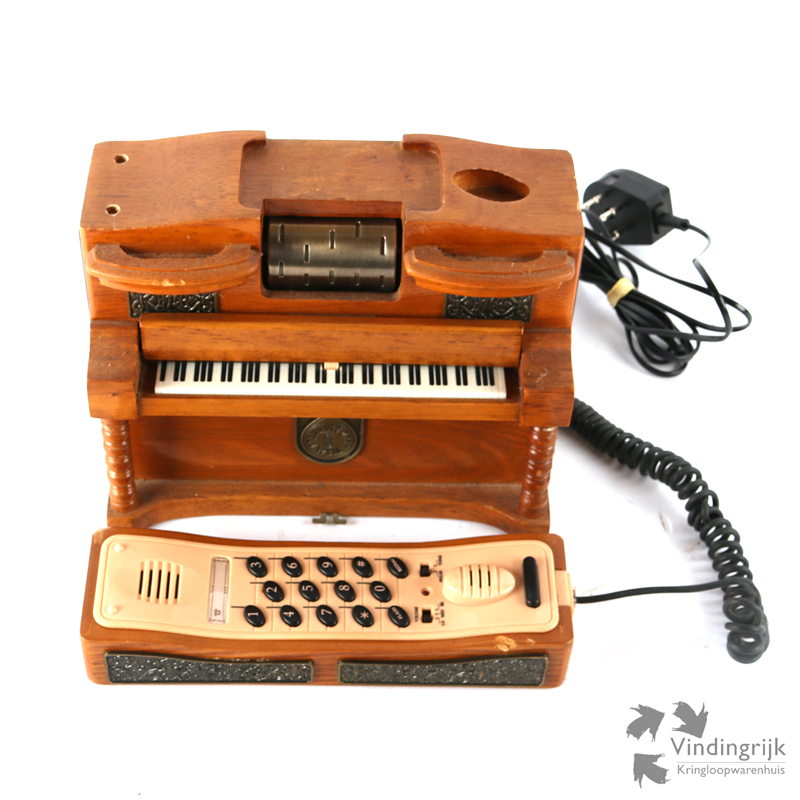 Telefoon in de vorm van een piano; als je de klep opent begint de muziekdoos te spelen. De telefoon is van hout met metalen beslag en hij is getest en werkt.