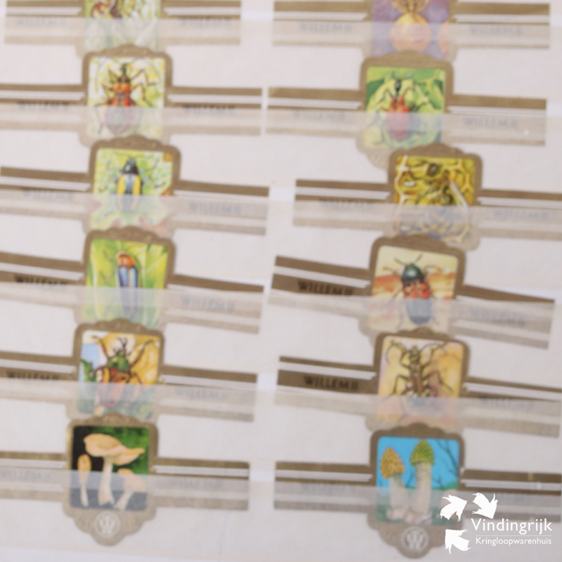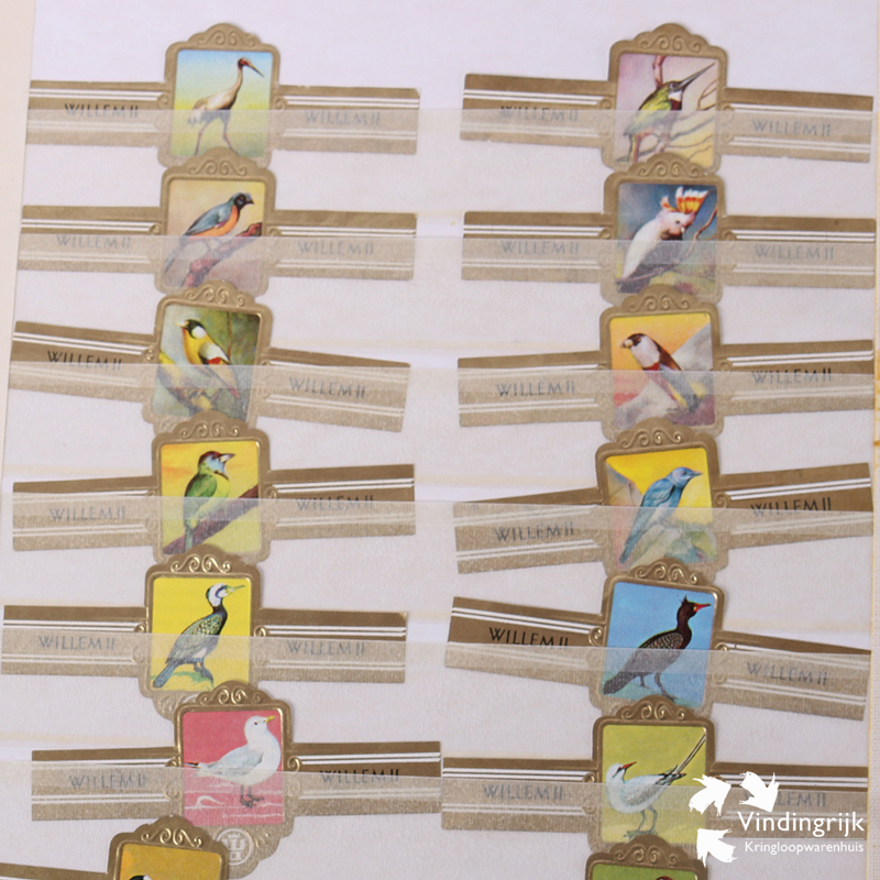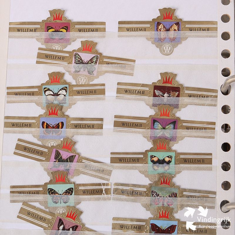 Verzameling sigarenbandjes in map. Het merendeel zijn bandjes van Willem II. Zo zijn er 3 pagina’s vlinders, maar liefst 14 pagina’s vogels en 5 pagina’s insecten 2 pagina’s paddestoelen 3 pagina’s bloemen en 2 pagina’s landenvlaggen. Per pagina zijn er 16 sigarenbandjes. Voor het overige zijn er nog 10 pagina’s met van alles wat. In totaal meer dan 400 bandjes bij elkaar.