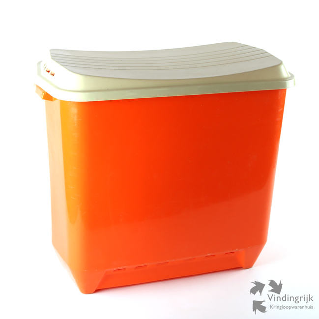 Uitgevoerd in de kleur oranje met een scharnierend deksel in de kleur beige.