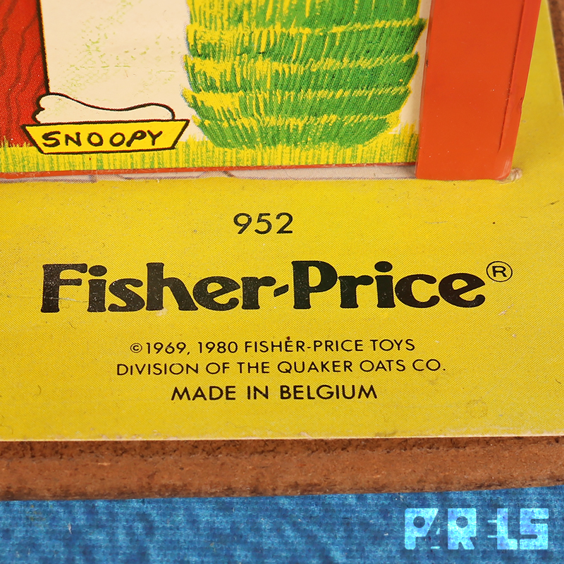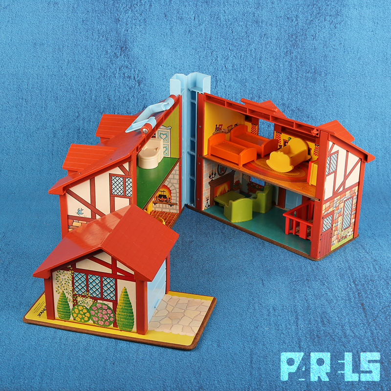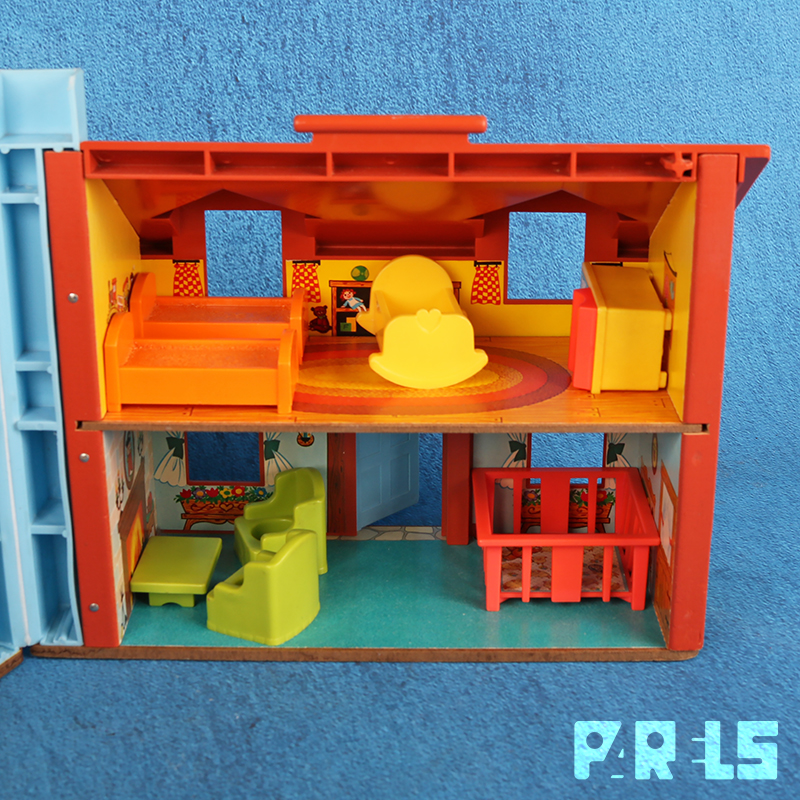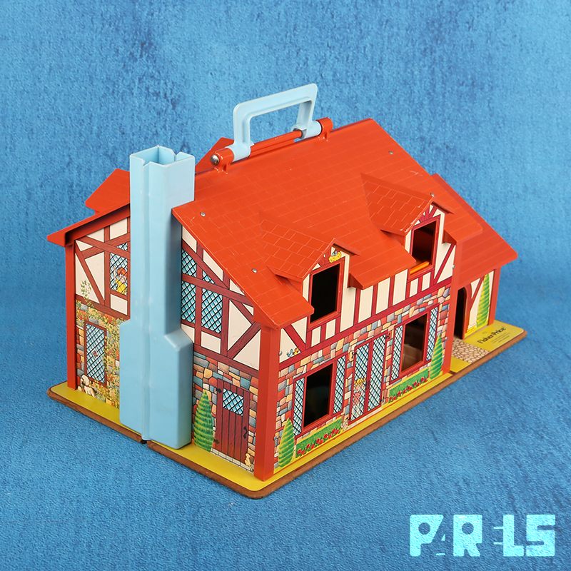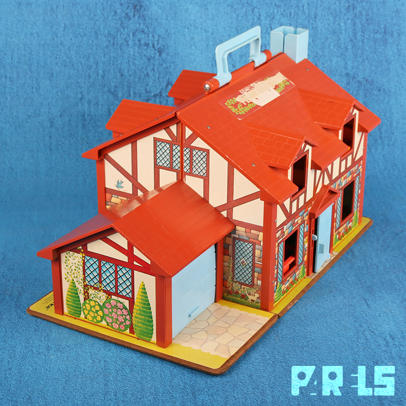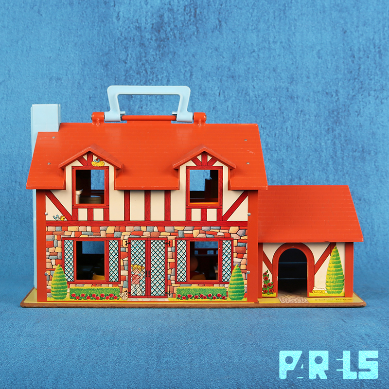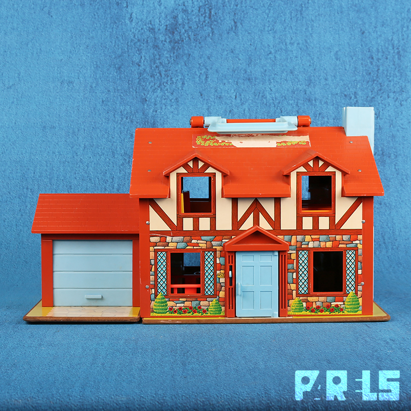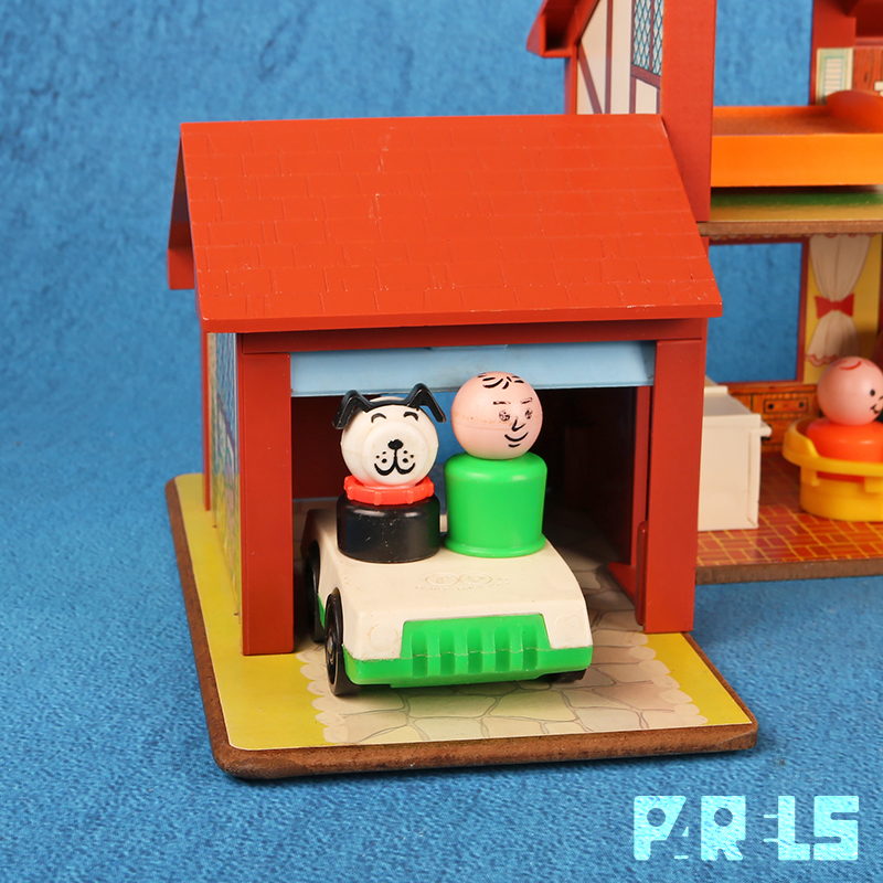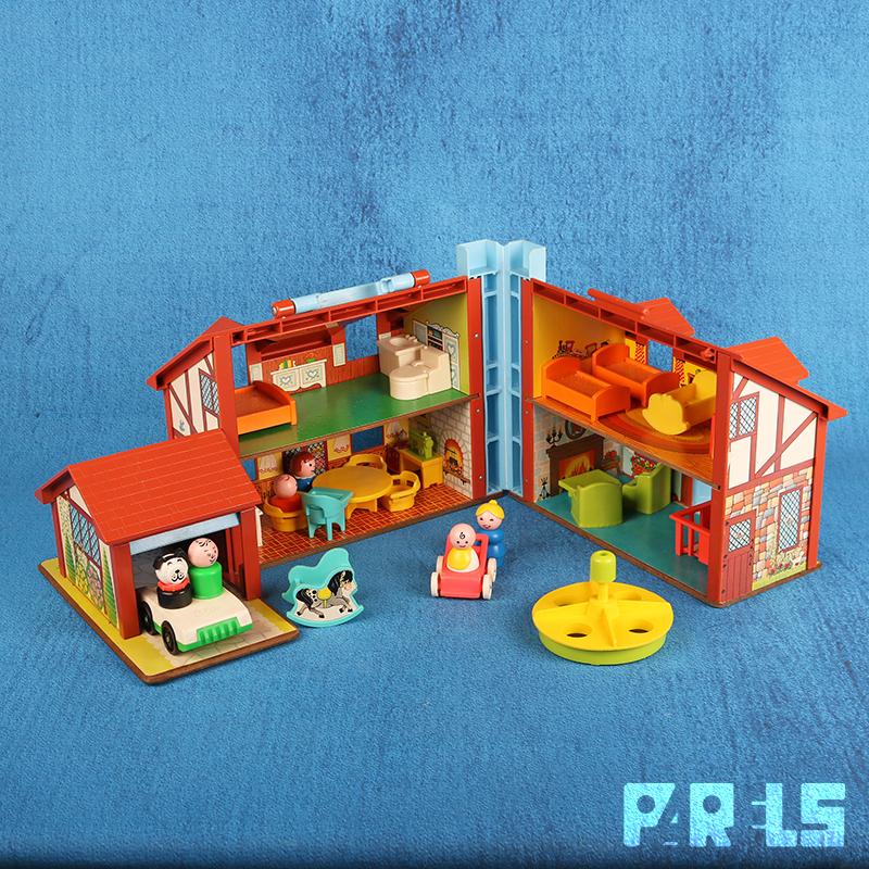 Vintage Fisher Price #952 familiehuis met garage, gemaakt van plastic en board (onderplaat, muren en verdiepingen). Het huis (met werkende deurbel) stamt uit 1969 en wordt geleverd met een tafel, kinderstoel en 4 stoelen, twee eenpersoons bedden, groot bed, een zitje bij de open haard, een kinderbedje, kinderbox en een wandelwagen. Ook een kledingkast, toilet, wastafel, fornuis en oven zijn aanwezig. Niet te vergeten dat er een ook nog een naaimachine tafel aanwezig is. In de tuin staat een draaimolen en hobbelpaard.