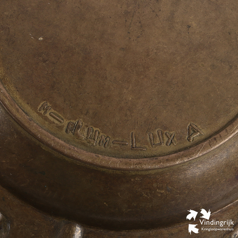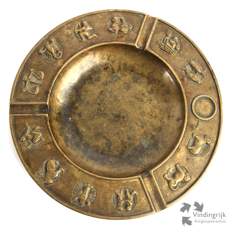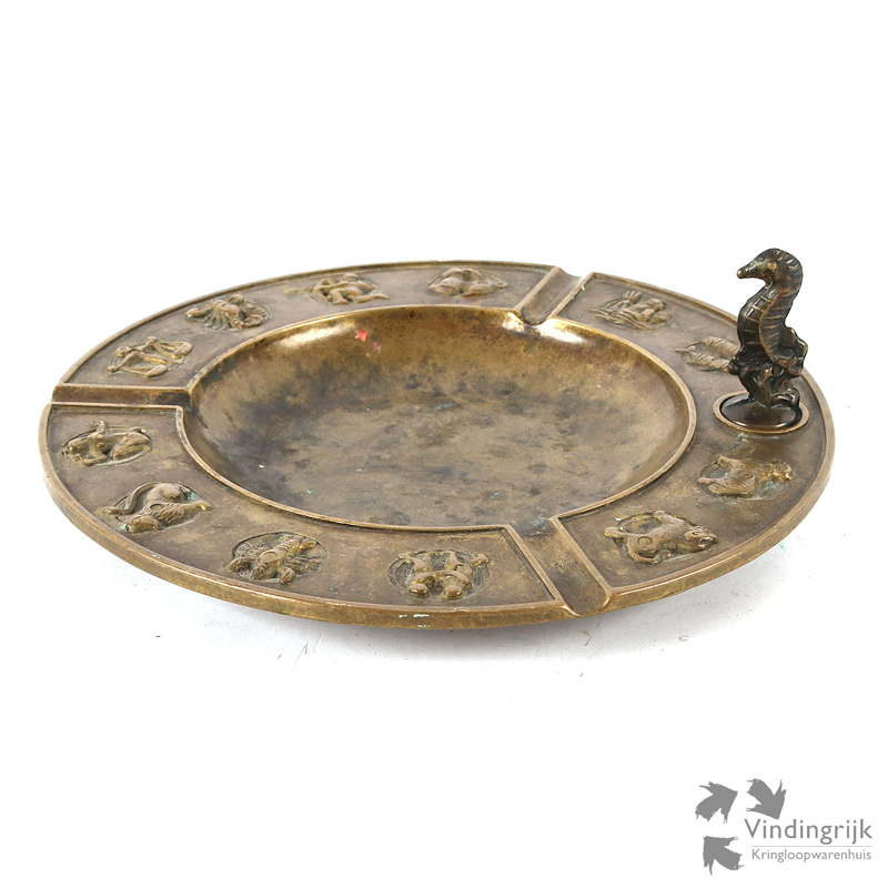 Vintage asbak van koper met rondom alle twaalf tekens van de dierenriem. Er is een sigarettendover bij in de vorm van een zeepaardje (zie foto). De asbak is vervaardigd door M-Plum-Luxa.