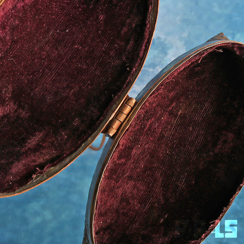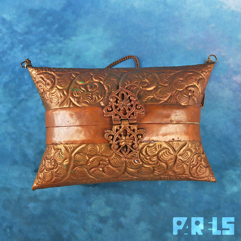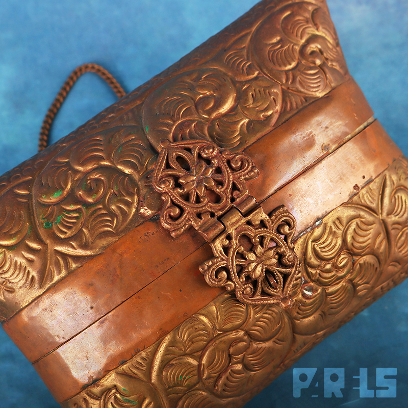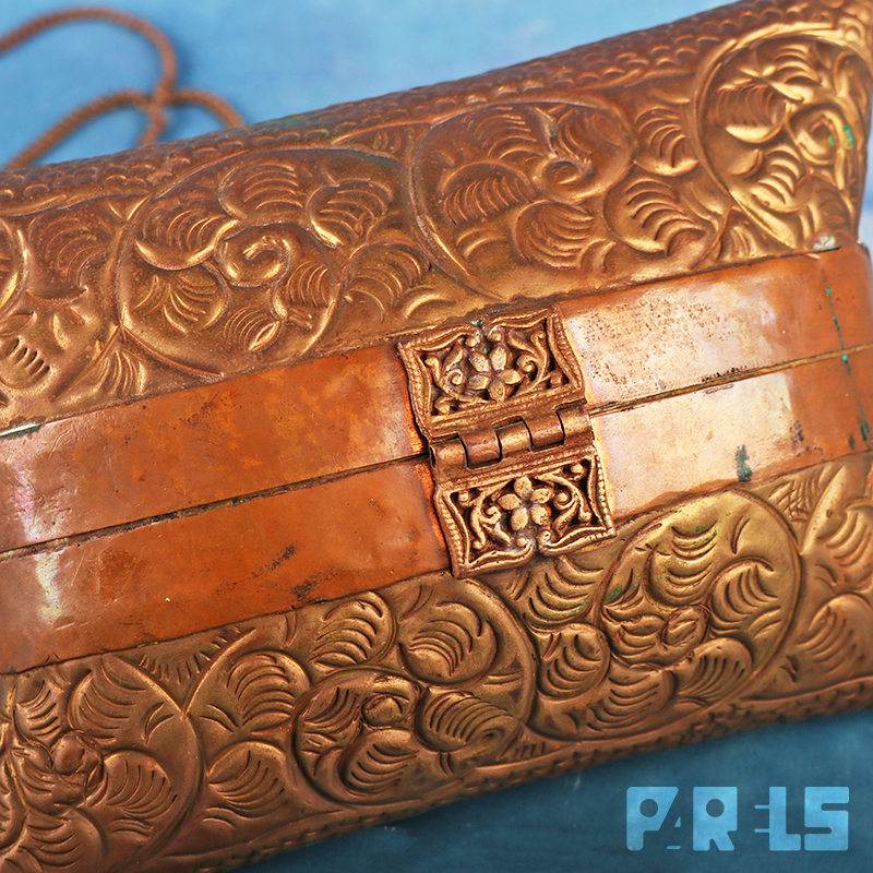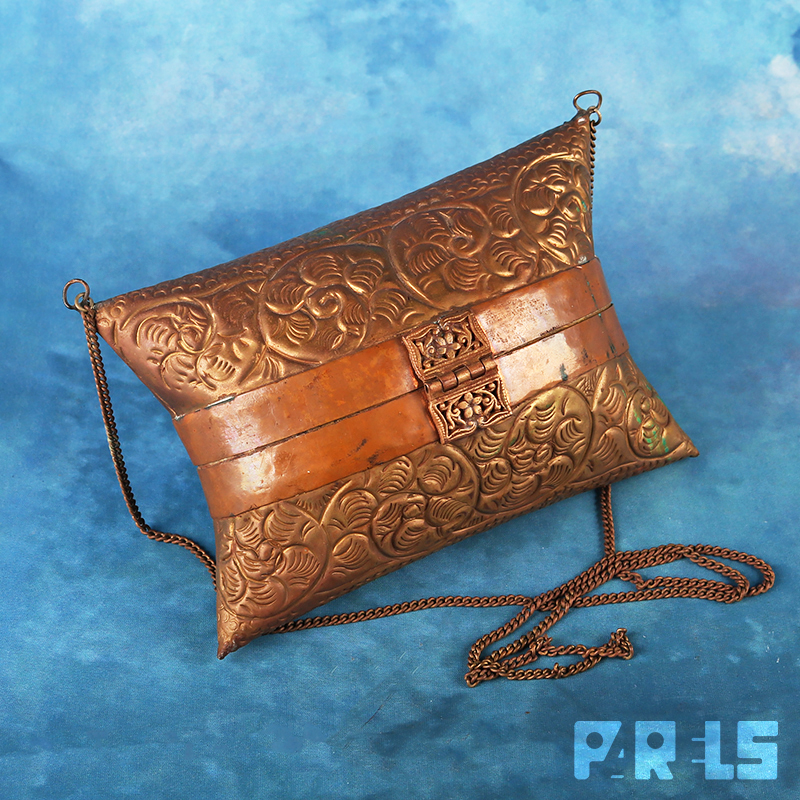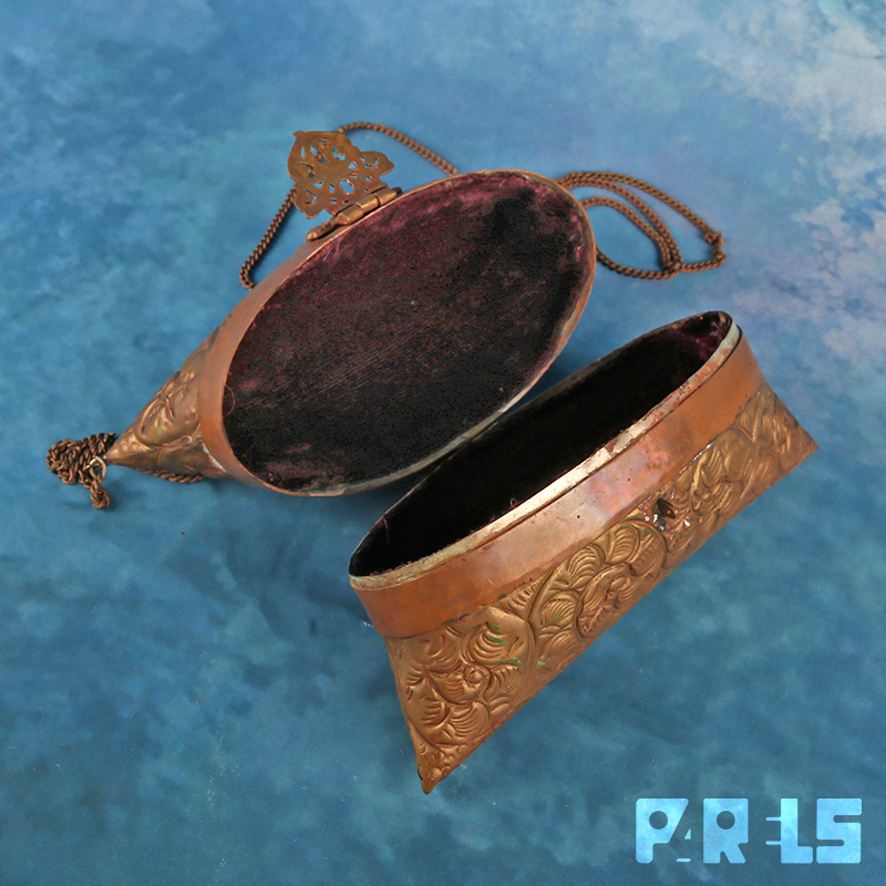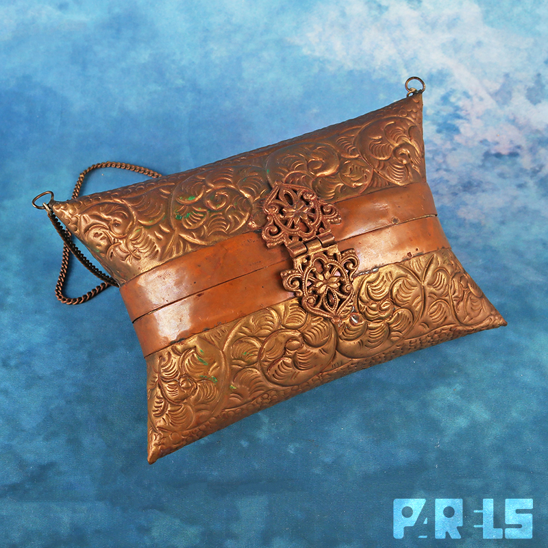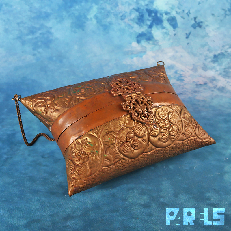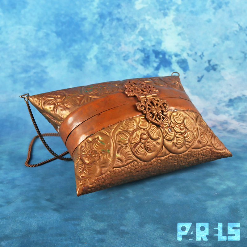 Originele vintage handtas, uit de jaren ’30/’40, volledig gemaakt van messing/koper. De tas komt uit India, heeft een sierlijke sluiting aan de voorkant, een sierlijk scharnier aan de achterzijde en een ketting als schouderband. Wordt vanwege de vorm ook wel een pillow tas genoemd. De binnenzijde is gevoerd met fluweel in de kleur aubergine. Het tasje is rondom fraai gedecoreerd met gehamerde sierlijke vormen.