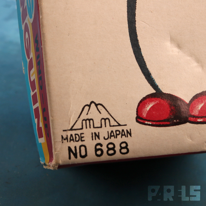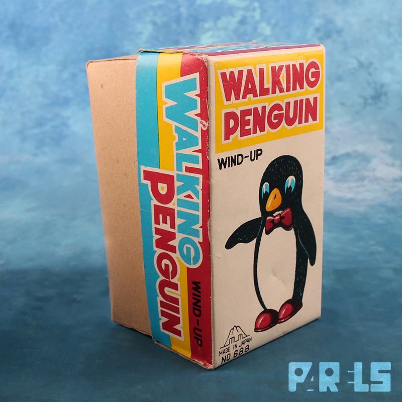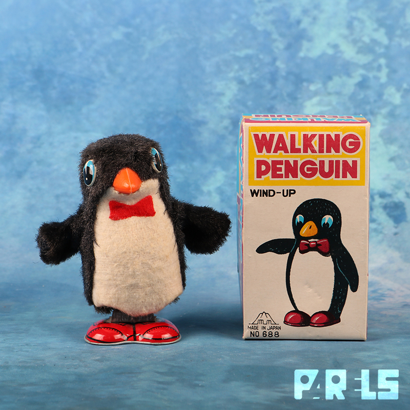 Het betreft de ‘Walking wind-up Penguin’ nr. 688, gemaakt in de jaren ’60 door Fuji Press Kogyosho Co. Ltd., een enigszins raadselachtig bedrijf in de geschiedenis van Japanse speelgoedfabrikanten uit die tijd.