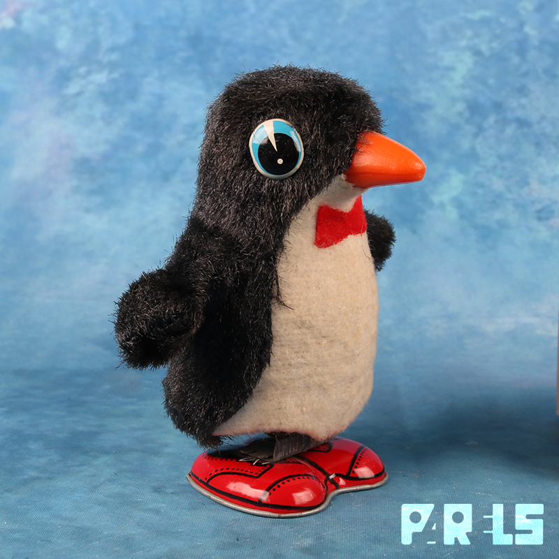 Dit leuke pinguïnfiguurtje met rode strik en schoenen werkt met een opdraai mechanisme en loopt vooruit zodra je hem met de sleutel opdraait. De pinguïn als figuur was geliefd vanwege zijn komische loopbeweging en herkenbare uitstraling.