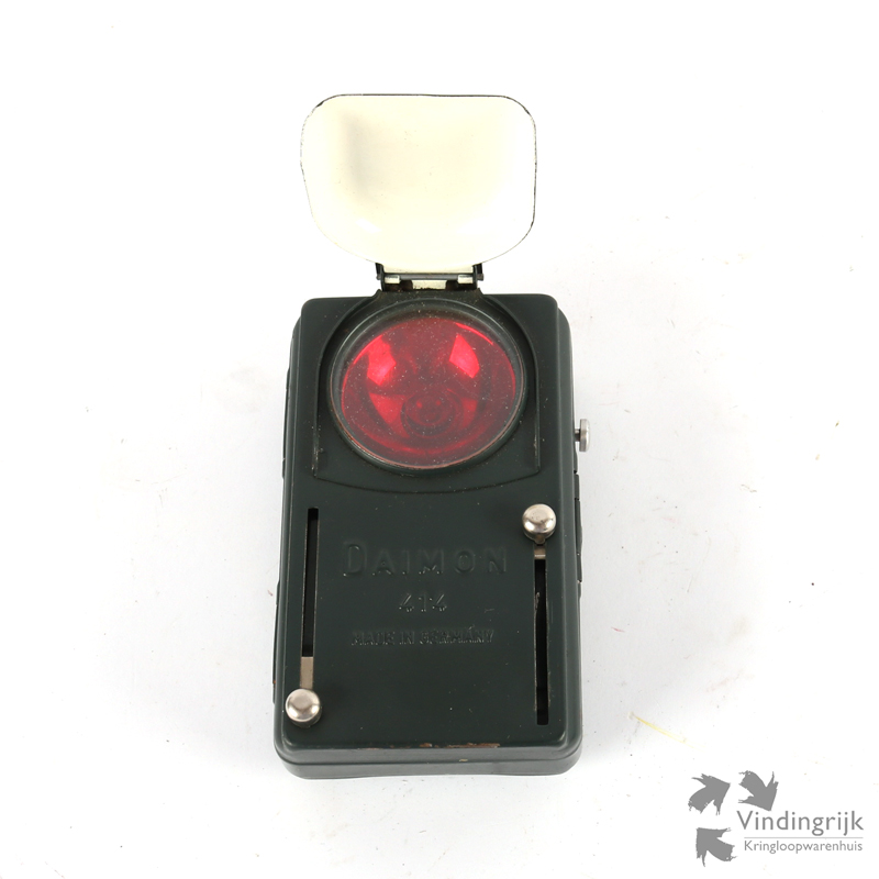 Vintage Duitse budenswehr zaklamp van het merk Daimon, nog in zeer goede conditie. Hij heeft de mogelijkheid om het licht rood, groen en wit te laten schijnen. Aan de achterkant is hij voorzien van lederen gespjes. Het Daimon merk werd gebruikt door het Duitse leger, in de Tweede Wereldoorlog.