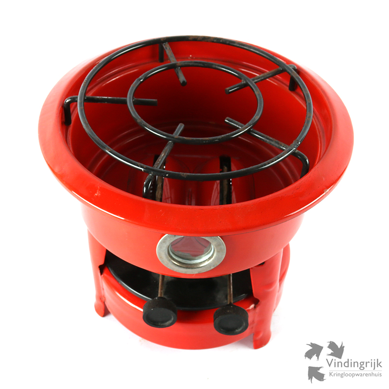 Rond 1875 werd petroleum voor eenieder bereikbaar en zo ook de speciaal daarvoor ontwikkelde apparaten, als petroleumstellen, lampen en kachels. Hier een vintage petroleumstel gemaakt van rood emaille.