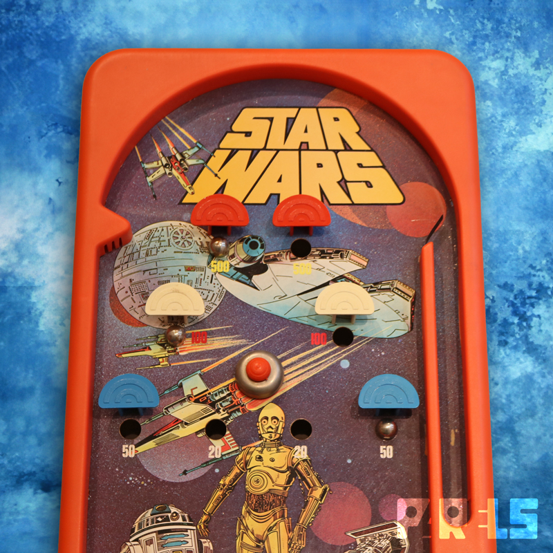 Vintage Star Wars tafelmodel flipperspel uit 1977, geproduceerd door Arcofalc, een Italiaanse speelgoedfabrikant die in de jaren ’70 en ’80 bekend stond om hun kleurrijke en betaalbare plastic speelgoed.