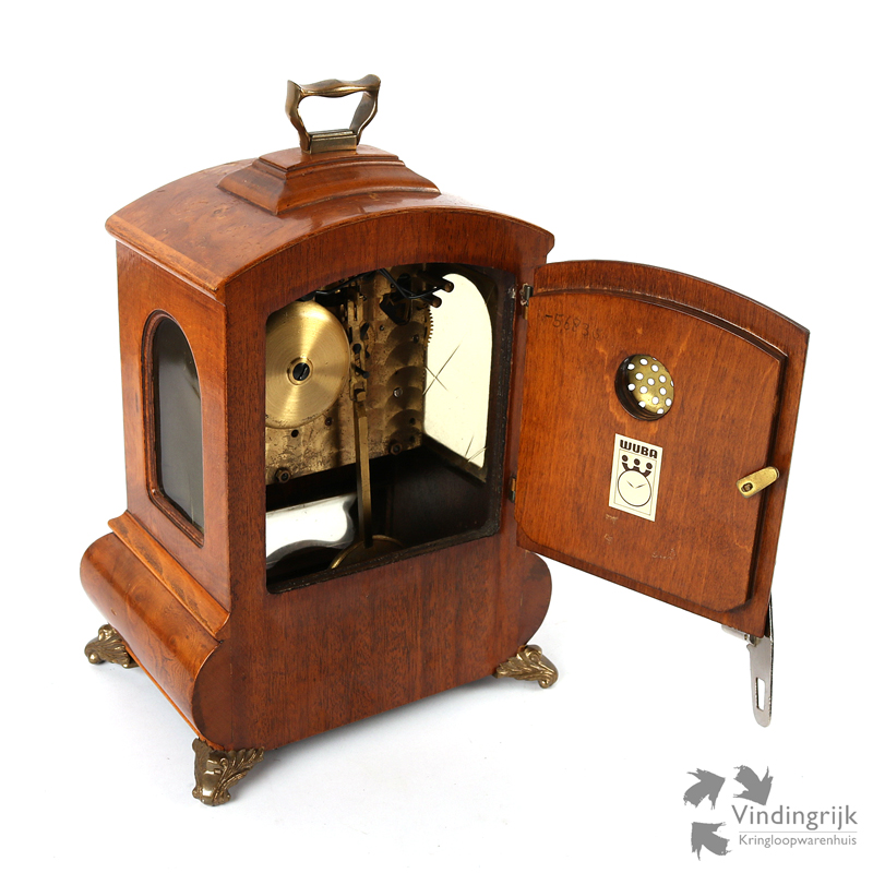 Vintage tafelklok van het merk Wuba met eikenhouten kast en metalen pootjes.