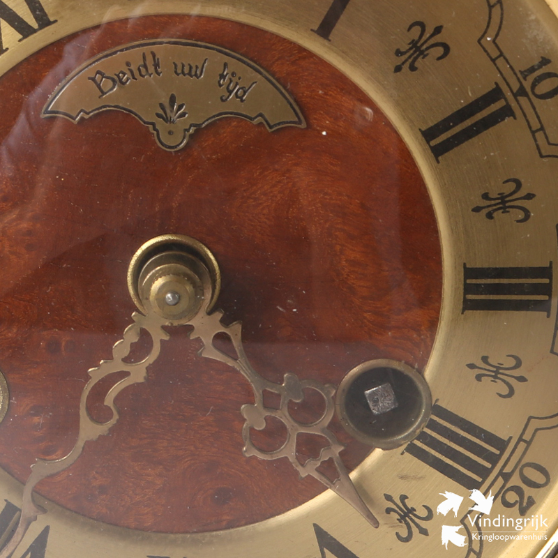 De klok is in goed werkende staat, heeft een wijzerplaat met Romeinse cijfers en in op het metalen plaatje staat “Beidt uw tijd”.
