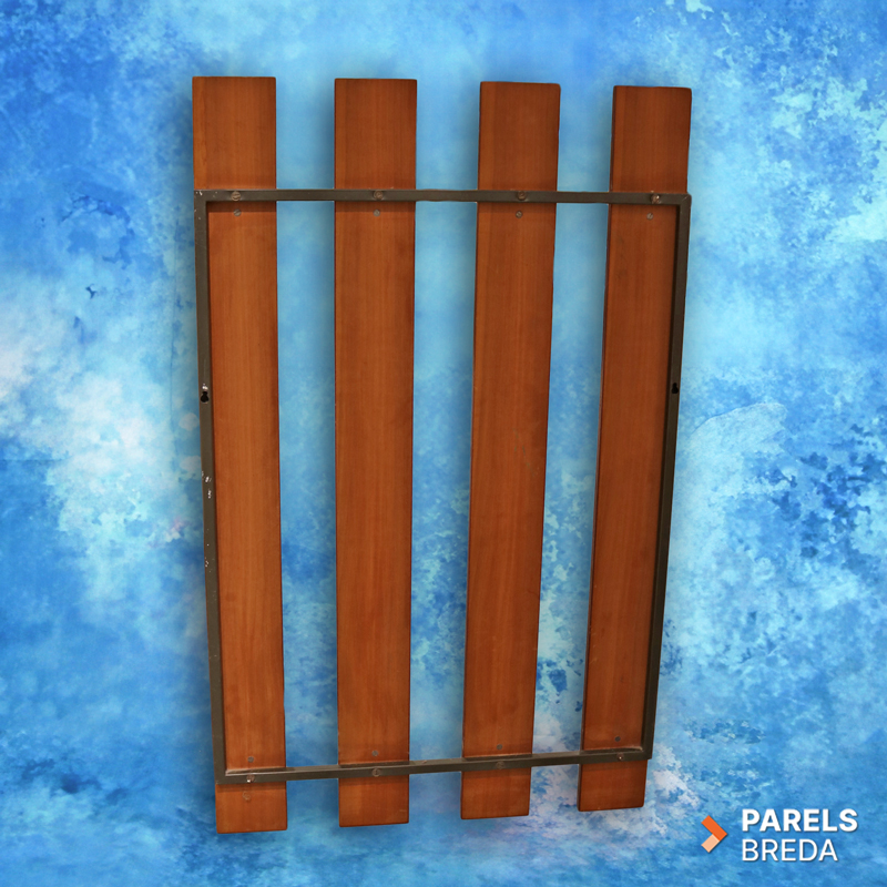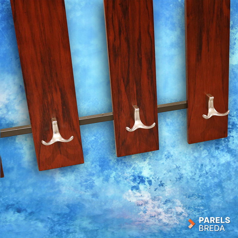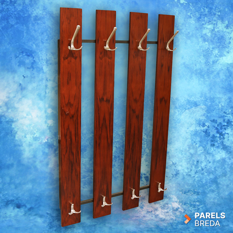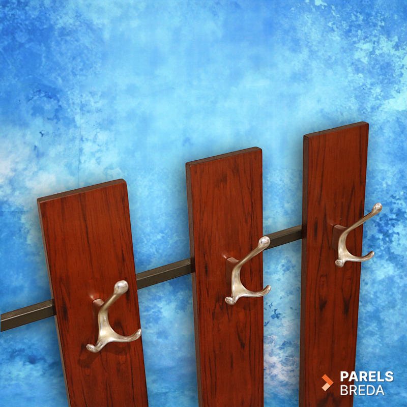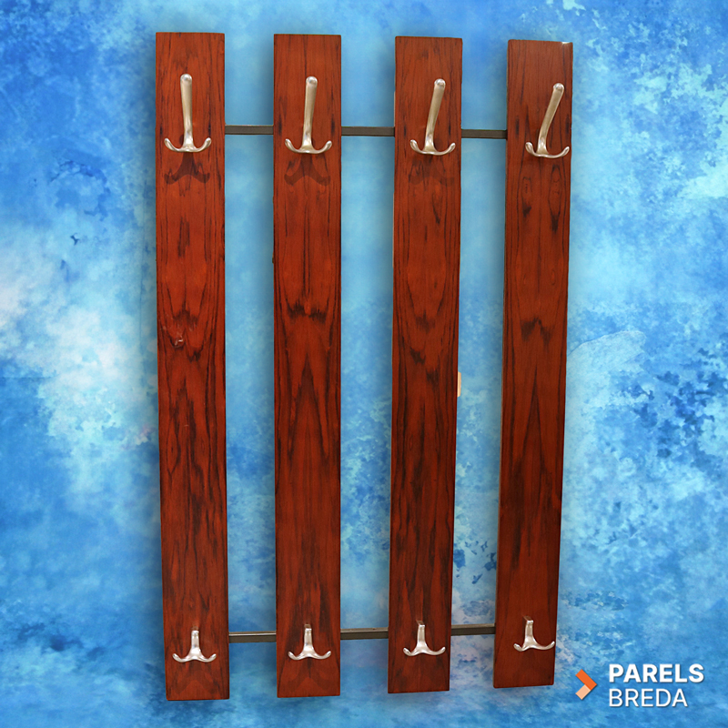 Vintage wandkapstok in Pastoe stijl met palissanderfineer op vier houten latten en een metalen basisconstructie. De kapstok beschikt in totaal over 20 haakjes, verdeeld in 16 kleine haakjes en 4 grotere haakjes, waardoor er volop ruimte is voor jassen, tassen, sjaals en accessoires.