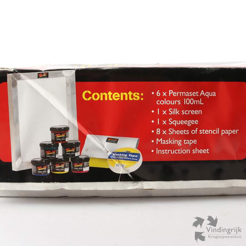 6 x 100 ml kleur, een aluminium zeefdrukraam (binnenmaat 24x28cm), een aluminium rakel, een aantal stencils om de afbeelding mee te maken en een duidelijk instructieblad.