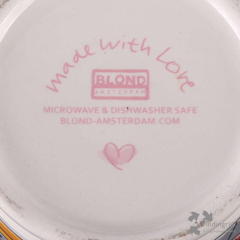 Blond Amsterdam beschildert voornamelijk persoonlijke theepotten, mokken en schilderijen. Hun gedeelde passie voor vrolijk en kleurrijk servies groeide uit tot een bont en gevarieerd assortiment. Het doel is om mensen met hun producten vrolijk en blij te maken. Dit is duidelijk te zien aan het handschrift van Blond wat je herkent aan de grappige en kleurrijke illustraties met een knipoog.