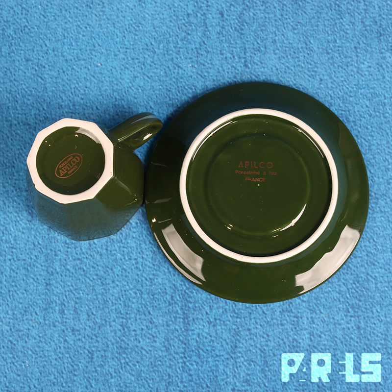 Één stel kop en schotel in de maat espresso van Apilco porselein in de kleur groen.