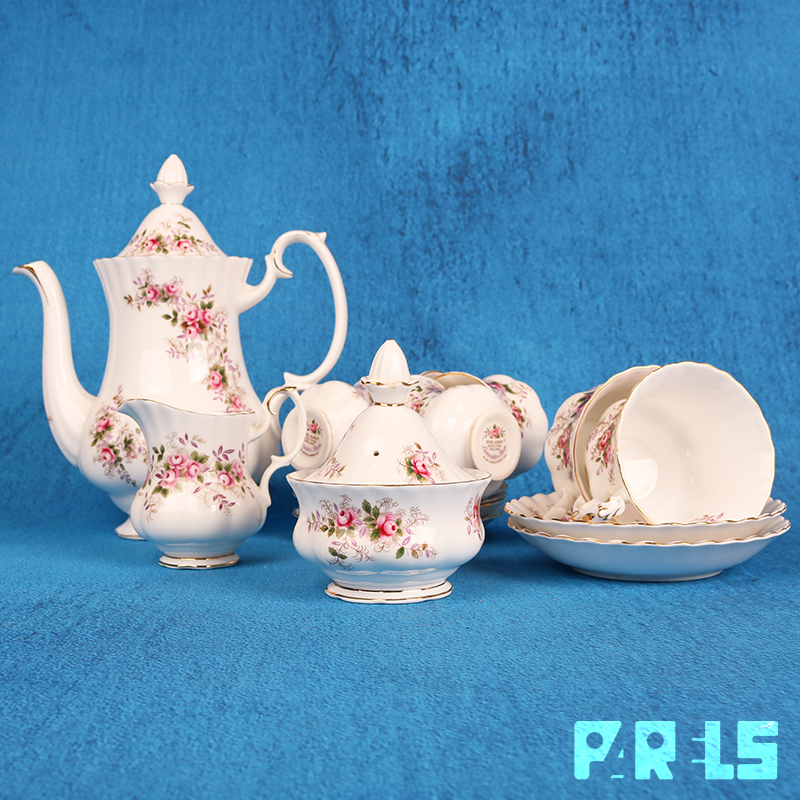 Royal Albert uit Engeland maakt al sinds 1904 serviesgoed van hoogwaardige kwaliteit porselein. Geïnspireerd door de typisch Engelse tuinen, werd het servies veelal gedecoreerd met en genoemd naar bloemen. Hier gaat het om het type “Lavender Rose”.