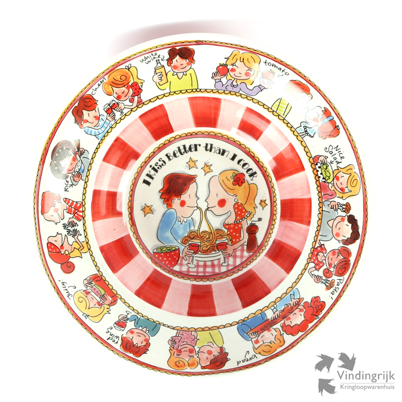 Hier een grote serveerschaal XL met opschrift “I kiss better than I cook” uit de serie “even bijkletsen”.