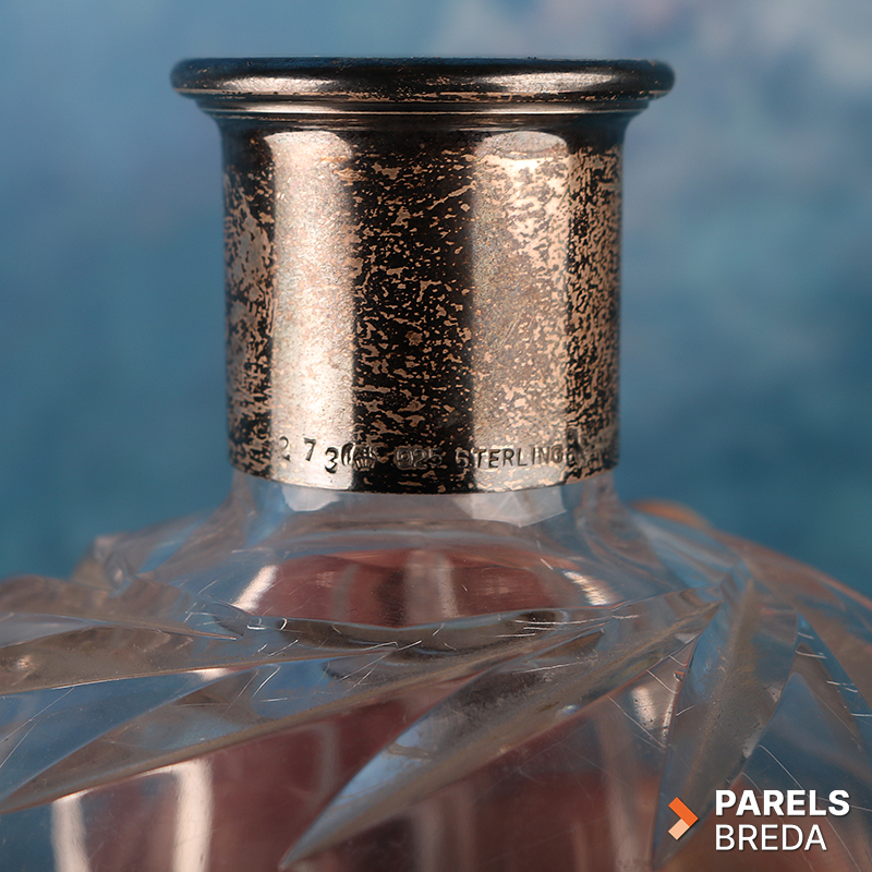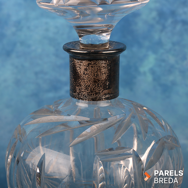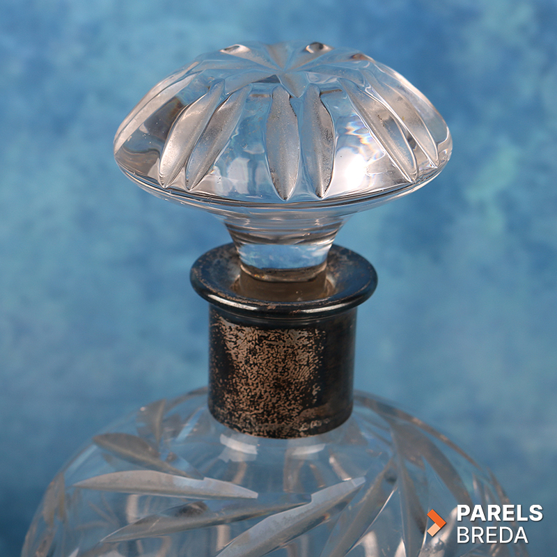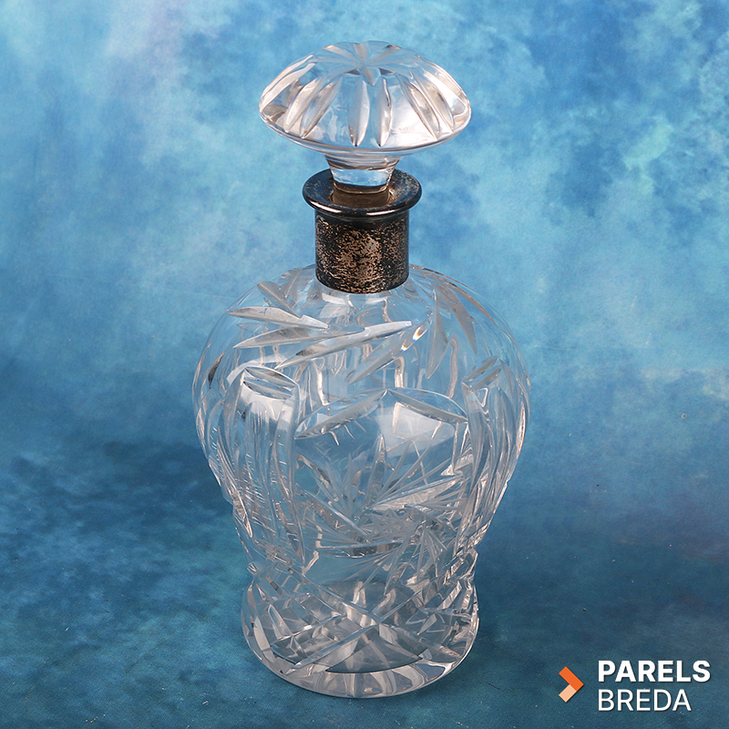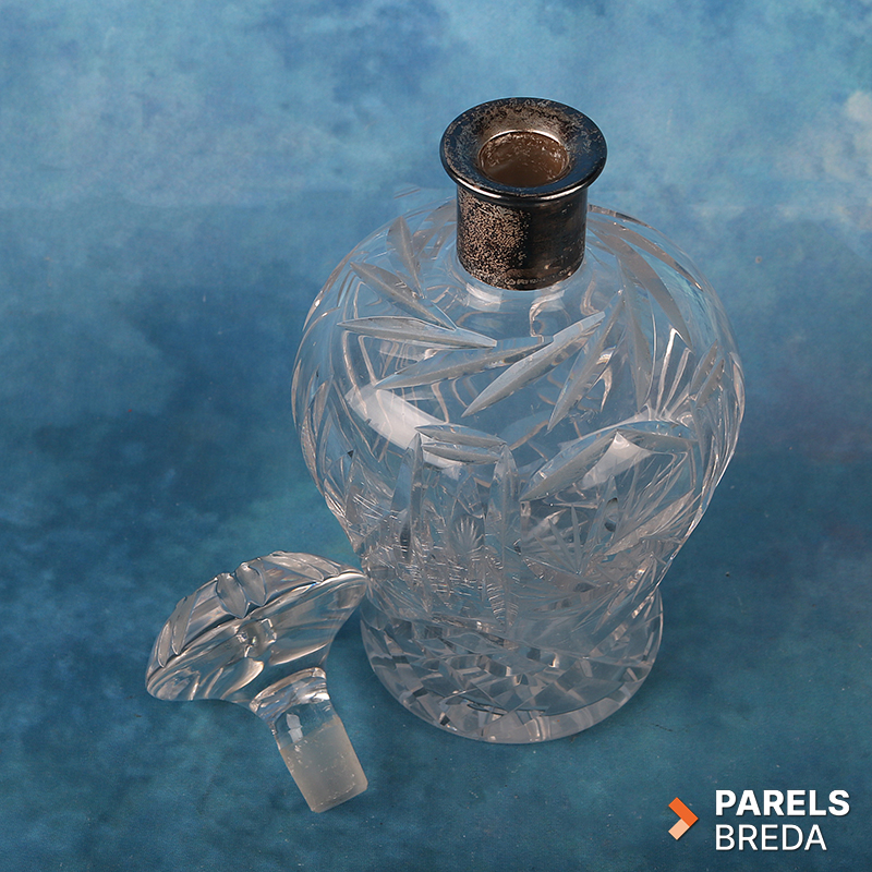 Geslepen kristallen decanter met kenmerkende patronen en een 925 zilveren halsband, afkomstig van Spritzer & Fuhrmann Curacao. Spritzer & Fuhrmann was een juweliershuis op Curaçao dat bekend stond om zijn zilverwerk en luxeartikelen. De decanter is circa 21 cm hoog en heeft een helder, zwaar geslepen kristallen corpus met bijpassende geslepen stop. De zilveren hals draagt de naam en merkstempels van Spritzer & Fuhrmann, bekend om hoogwaardige zilver- en glaswerkproducties uit de tweede helft van de twintigste eeuw.