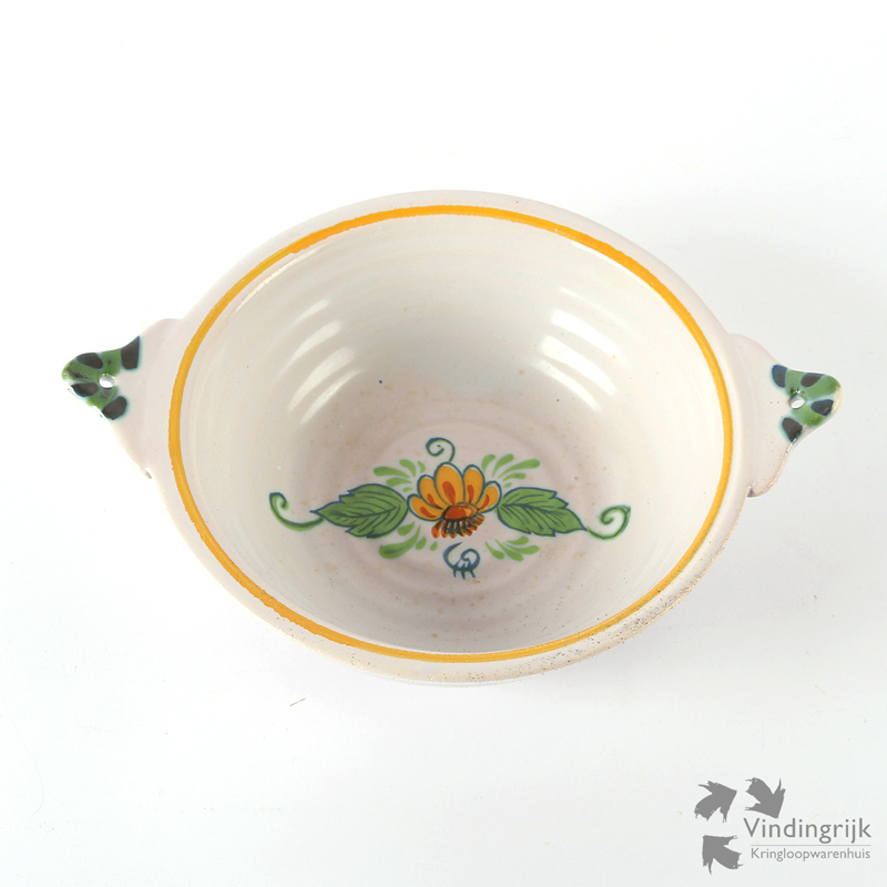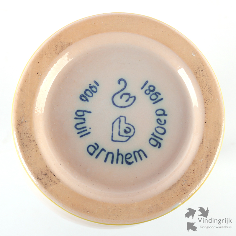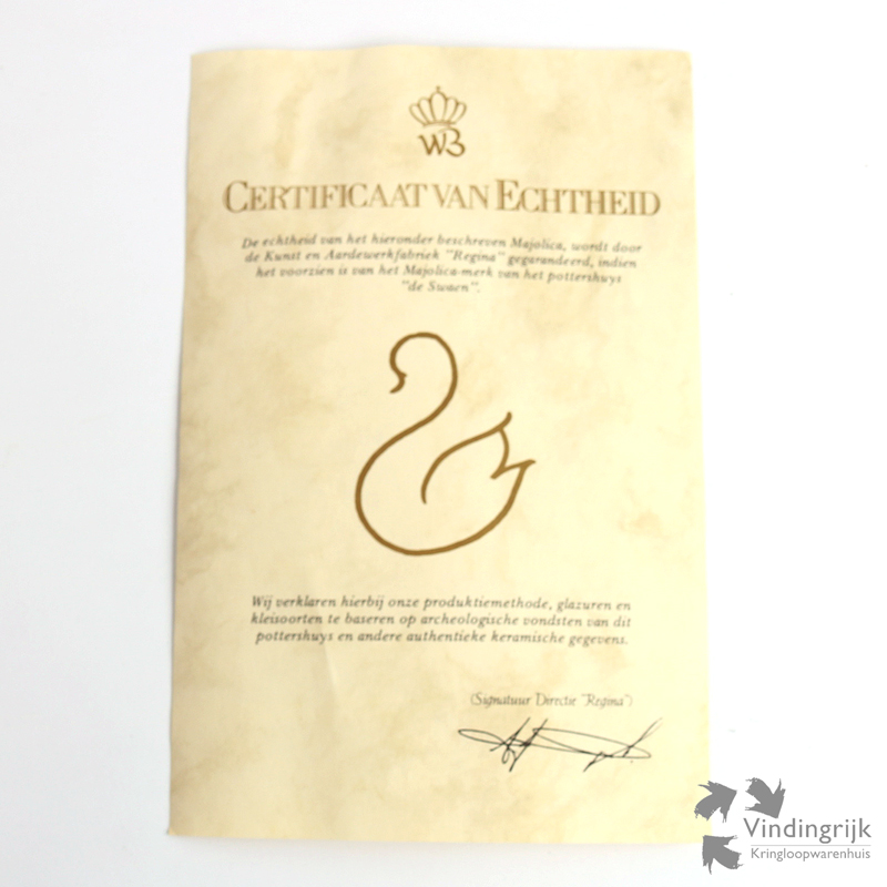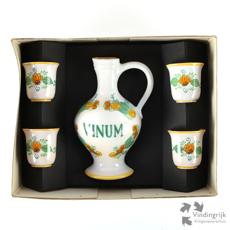 Wijnkan met 4 bekers gemaakt van aardewerk in de Majolica traditie. Er zit ook nog een bakje bij om hartige hapjes te presenteren. De echtheid wordt door de Aardewerkfabriek Regina gegarandeerd wanneer het majolica-merk van het pottershuys “de Swaen” is aangebracht, zoals in dit geval. Deze wijnset is overigens gemaakt voor een bedrijfsjubileum.