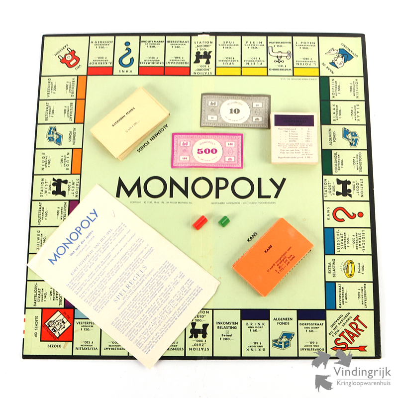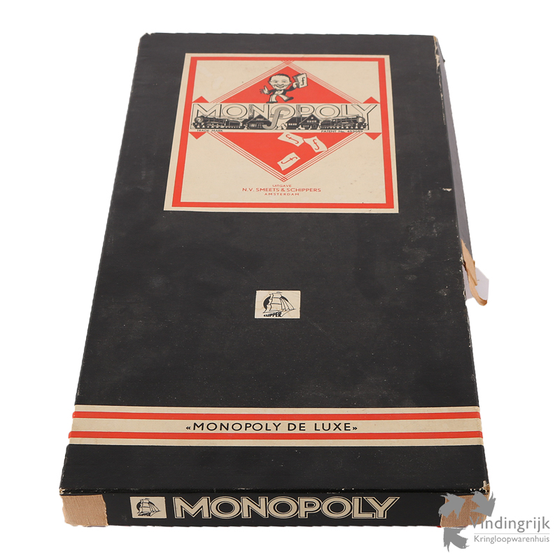 Dit is een Monopoly-spel dat dateert van de jaren ’60. Het is een uitgave van Smeets & Schippers te Amsterdam. Van het deksel zijn de hoeken geplakt met nog een scheurtje aan de zijkant. Het spel met de huizen en hotels van hout is compleet in de originele doos en het spelregelboekje zit er ook nog bij.