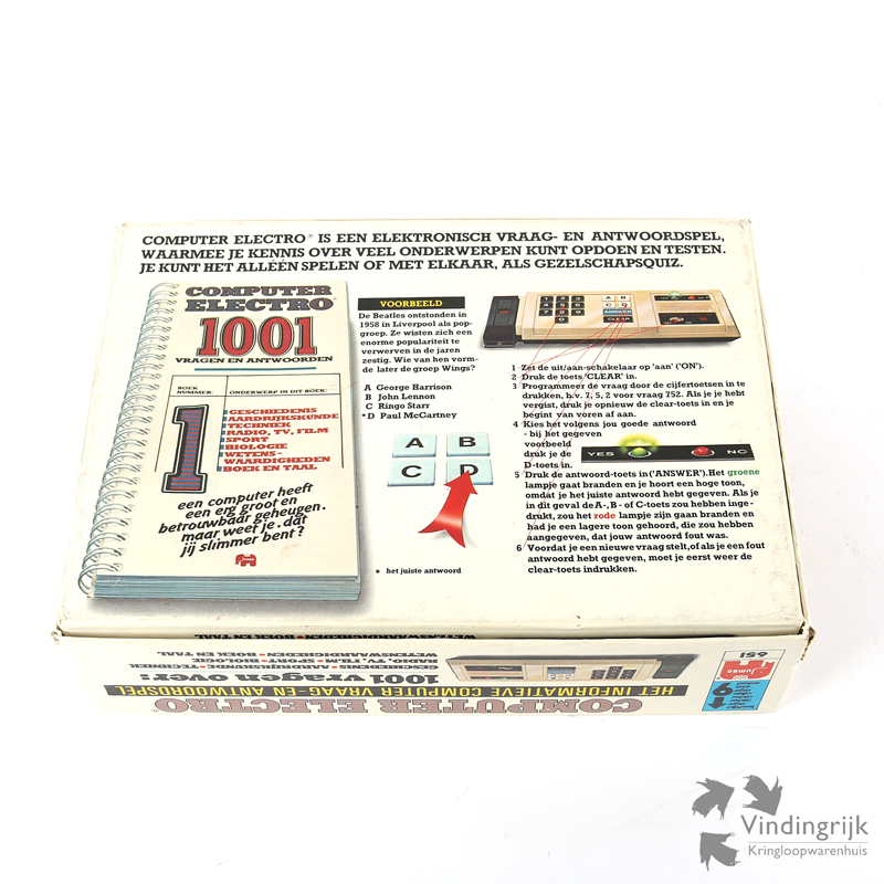 Vintage Computer Electro van het merk Jumbo. Het is een informatief computer vraag- en antwoordspel, dat werkt op batterijen. Onderwerpen zijn geschiedenis, aardrijkskunde, techniek, sport, biologie en wetenswaardigheden. Er zit een boekje bij met 1001 vragen en antwoorden. Wordt geleverd in de originele doos.