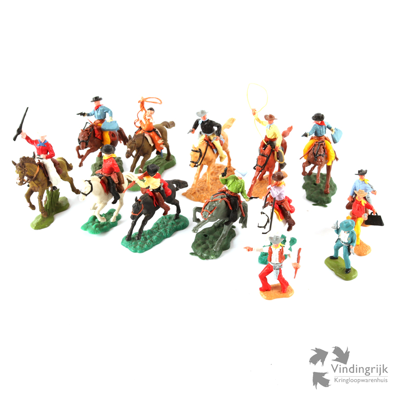 10 cowboys te paard, waarvan 2 van Timpo Toys, 2 van Britain LTD en 6 uit Hong Kong.