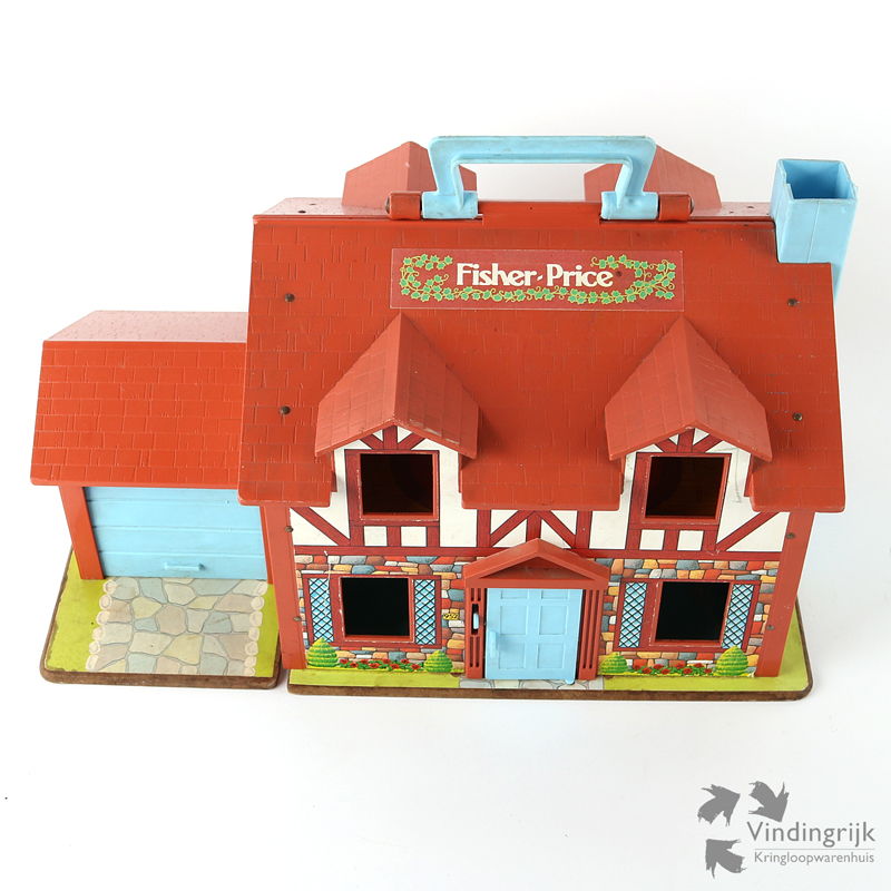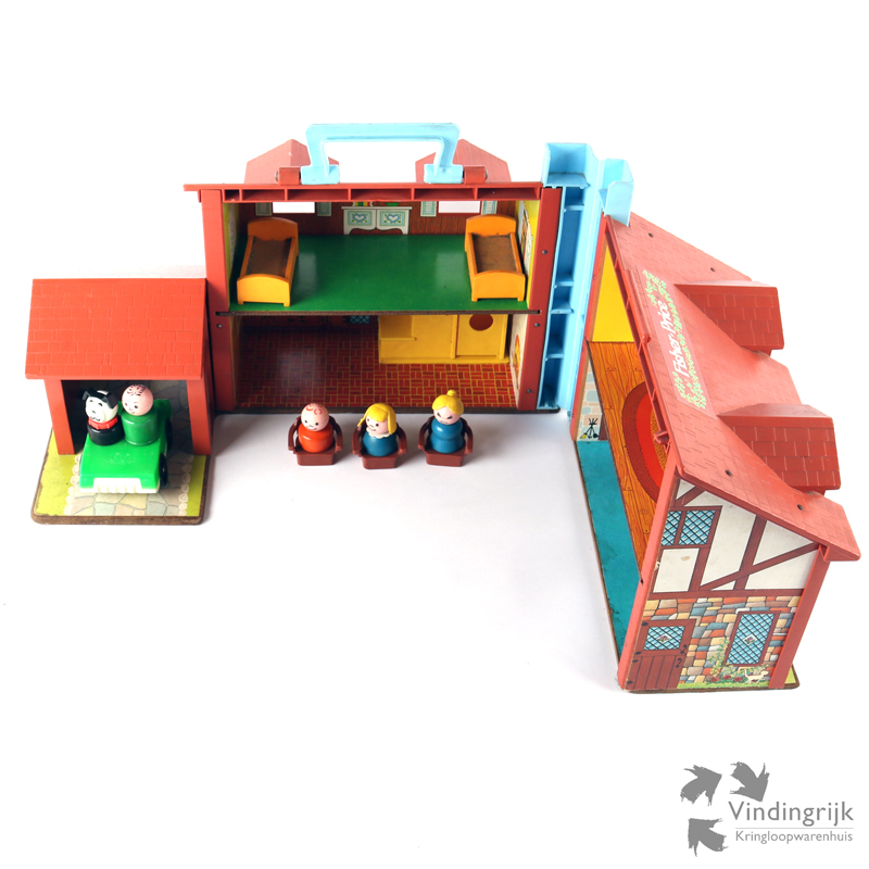 Fisher Price # 952 familiehuis met garage, gemaakt van plastic en board (onderplaat, muren en verdiepingen). Het huis (met werkende deurbel) stamt uit 1969 en wordt geleverd met een tafel en 3 stoelen, twee eenpersoons bedden en de trap met kelderruimte. In de garage staat een groene automobiel met 2 zitplaatsen. De familie bestaat uit vader, moeder, zoon, dochter en de hond en in de tuin staat een draaimolen.