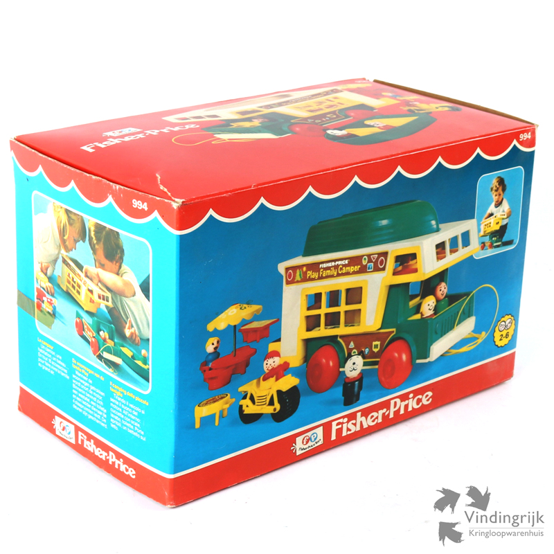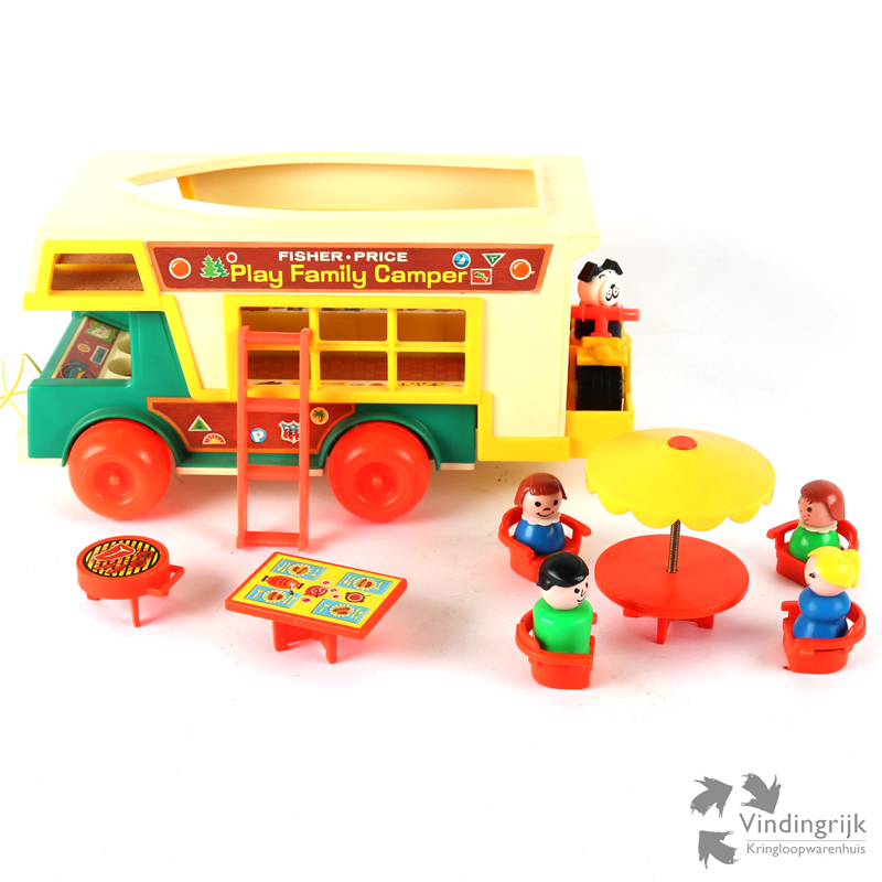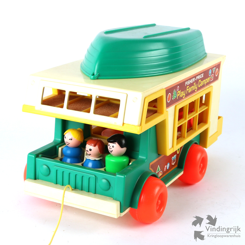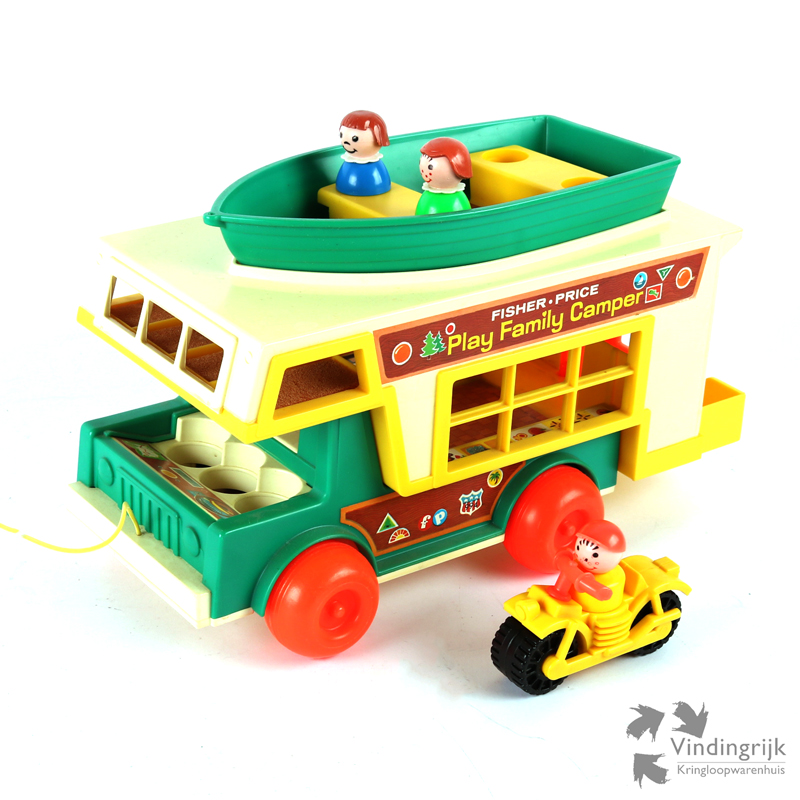 Vintage Play Family Camper met boot #994 van Fisher Price, oorspronkelijk uit 1973. Als de camper wordt voortgetrokken, snort de motor.