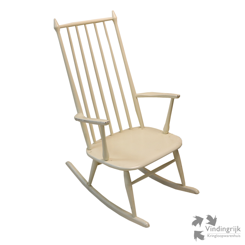 De schommelstoel is gemaakt van hout en heeft een klassieke uitstraling.