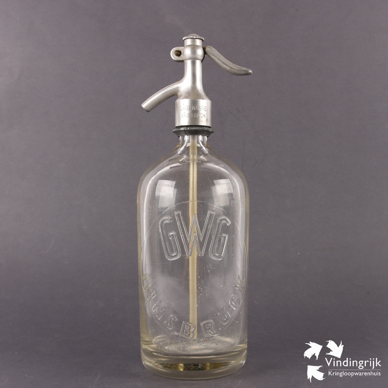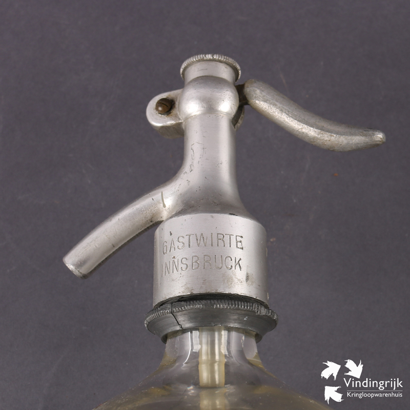 Vintage spuitfles van de Oostenrijkse brouwerij Gastwirte Innsbruck. Het spuitmechanisme is gemaakt van roestvrij staal en gemaakt van dik glas. Op de fles staat het bedrijfslogo en de stadsnaam Innsbruck vermeld in reliëf.