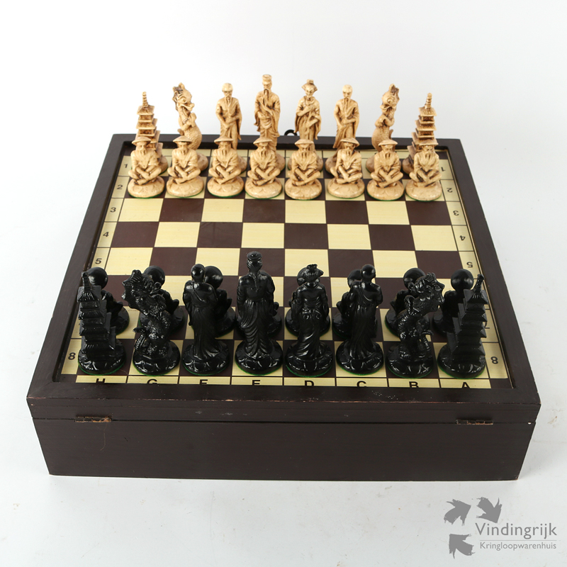 Chinees schaakspel in houten doos. De stukken zijn gemaakt van kunststof en het kistje is van hout. De bodem en het deksel zijn aan de binnenkant gevoerd met rood vilt.
