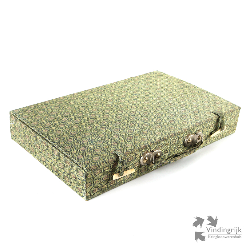 Met de overige benodigdheden zit het spel in een koffertje met een buitenkant van stof in bronskleur.