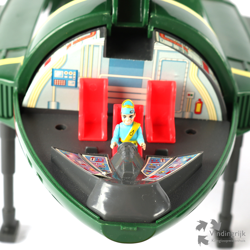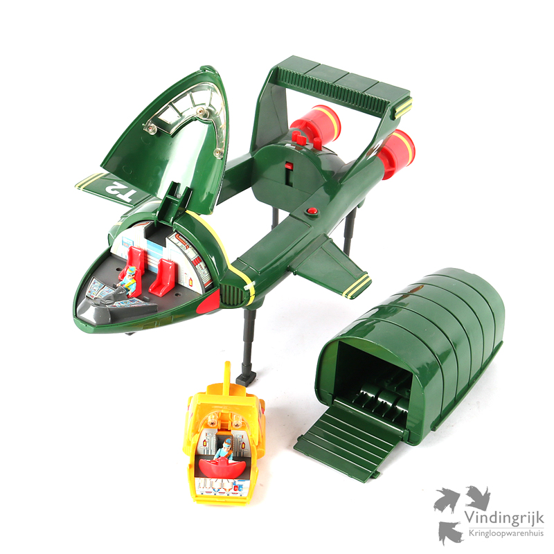Grote Thunderbirds 2, gemaakt van kunststof. Het toestel maakt verschillende geluiden, de poten zijn inklapbaar en de voorkant met de cockpit kan geopend worden, waar Virgil Tracy zit. Onder de neus zit een haak aan een touw dat kan worden uitgetrokken en met een knopje weer in het toestel worden opgerold.