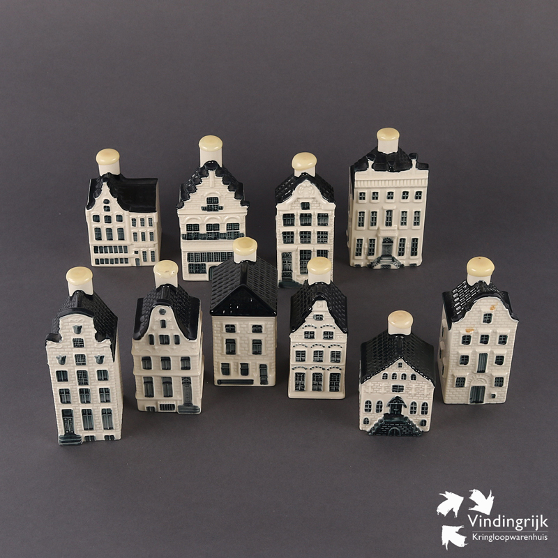 Set van 10 KLM huisjes Delfts Blauw. Sinds de jaren 50 geeft KLM elke passagier in business class een Delfts blauw miniatuur van een karakteristiek Hollands huisje gevuld met jenever van Bols.