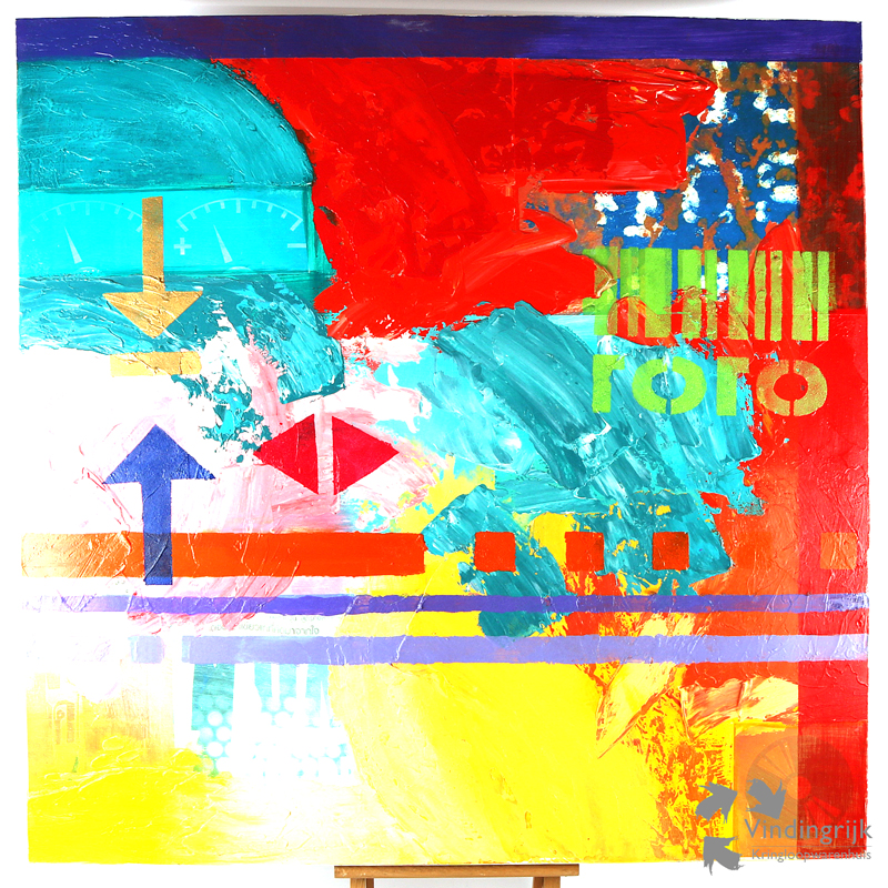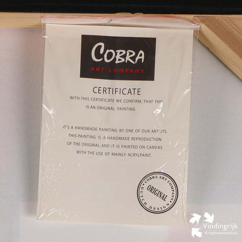 Groot abstract schilderij op doek met delen dik aangezette verf. Het werk is gemaakt door één van de kunstenaars van de Cobra Art Company uit Veenendaal. Op de achterkant zit een certificaat met de verklaring dat het werk aldaar is vervaardigd.
